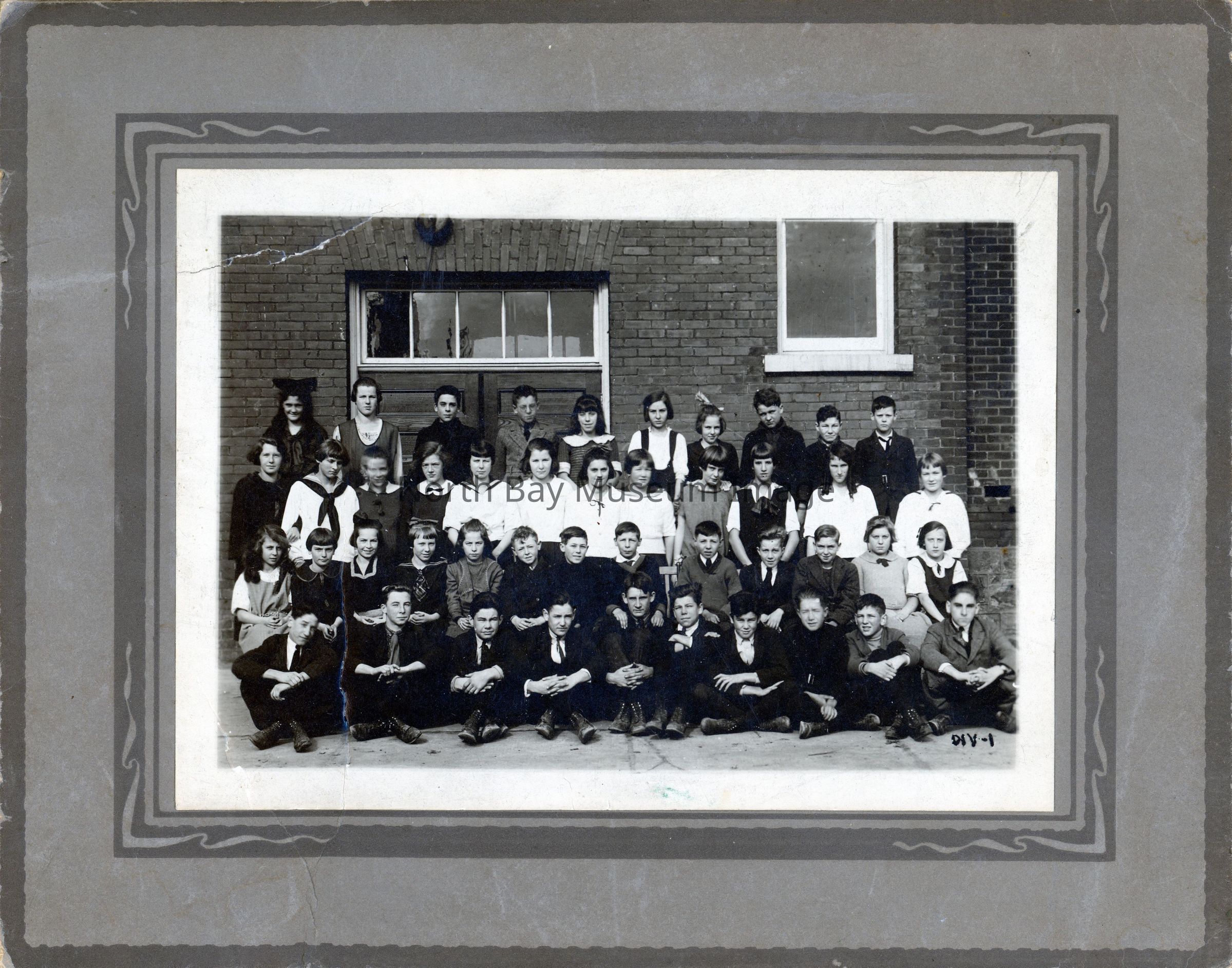Group photo showing class standing outside of school. On back of photo, Ralph Elston Grade IV 1922 in written in ink.