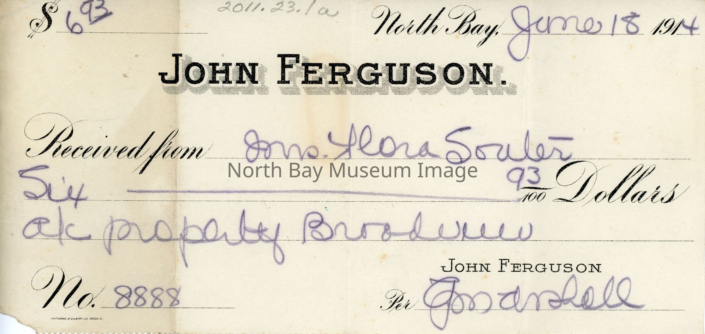 Receipt of money recieved by John Ferguson from Flora Souter. Part of Souter collection.
