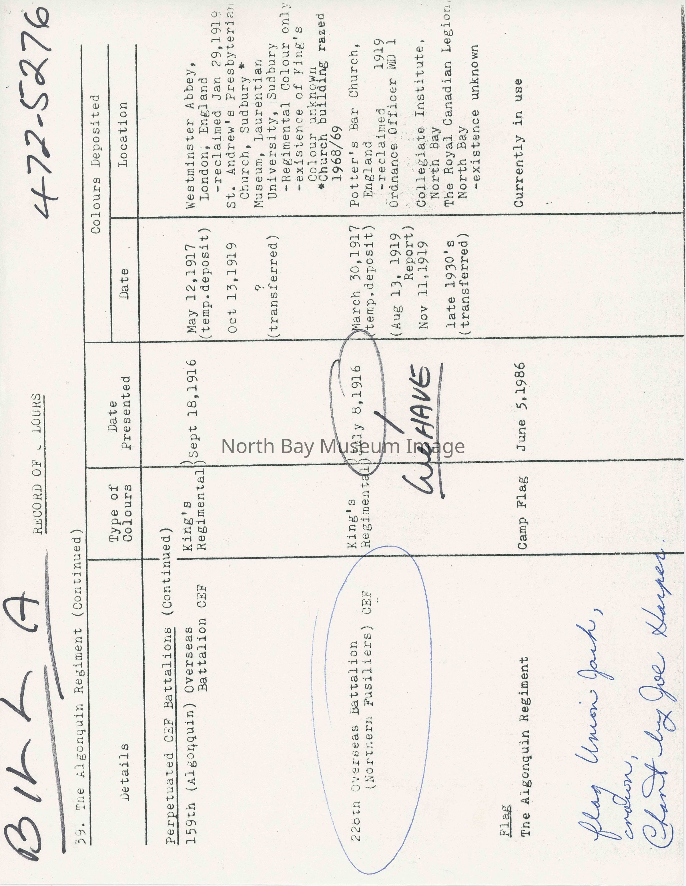 This page is the "Record of Hours" for the Algonquin Regiment. Events spoke about on the sheet vary over a large time period, with some dates as early as July 1916, as late as June of 1986.