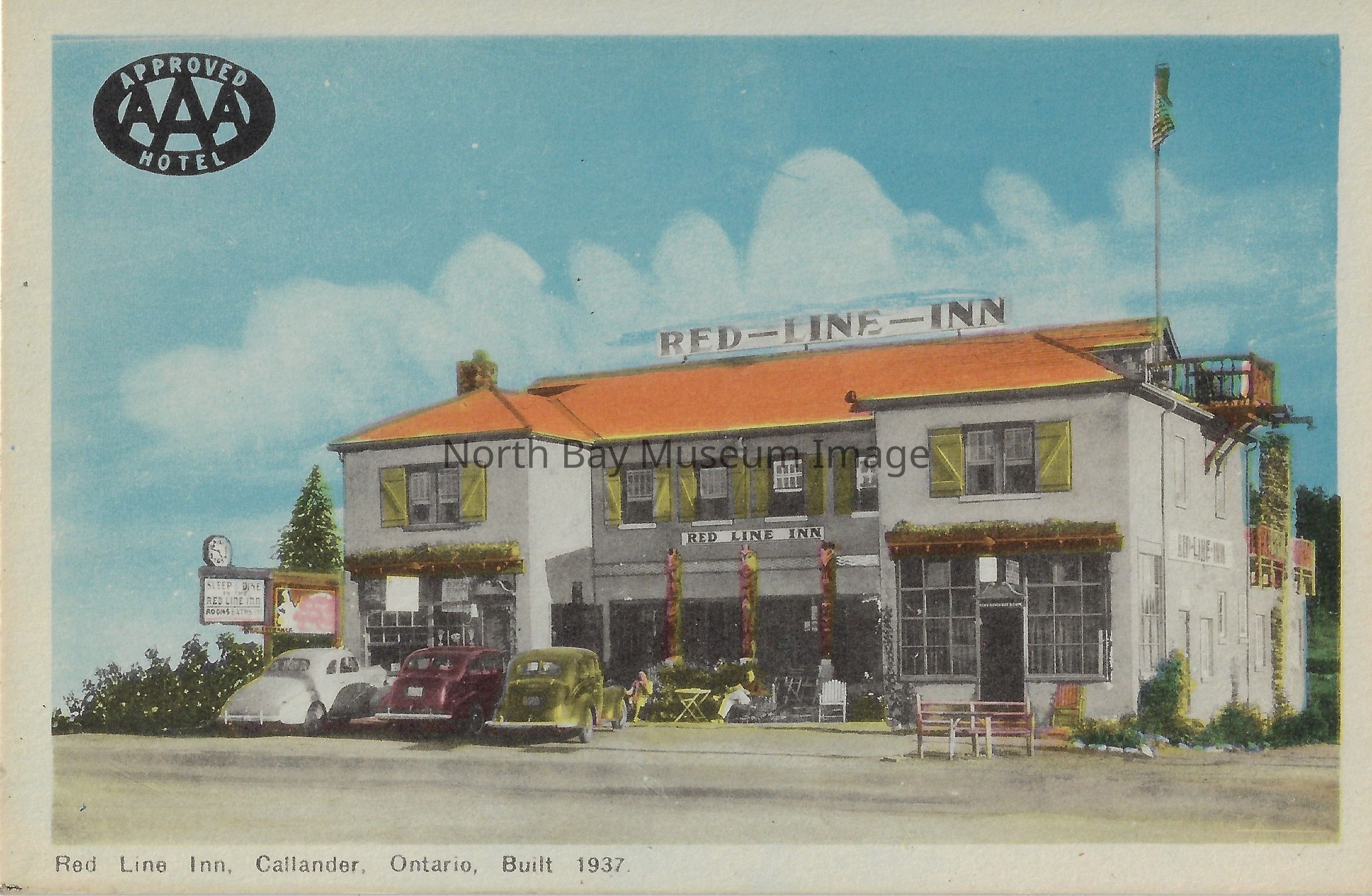 Colour, painted-postcard showing "Red Line Inn", sign saying "Sleep & Dine In The Red Line Inn: Rooms...", and the marking "Approved AAA Hotel". Pictaresque, red-roofed building with white walls pictured on front. Totem poles, old, colourful cars and a patio are also shown.Date(s) of Creation