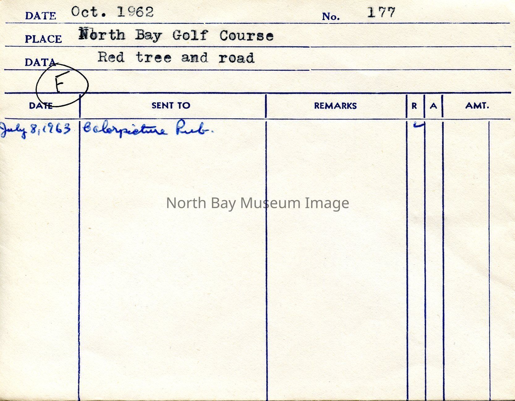 Envelope (a) contains the negative (b) of Red Tree and Red Road at the North Bay Golf Course. The image captures a beautiful red tree on the north bay golf course. A part of the Forder Collection. The photographers original accession number is 177. All the publications of the images are written on the envelopeCreator