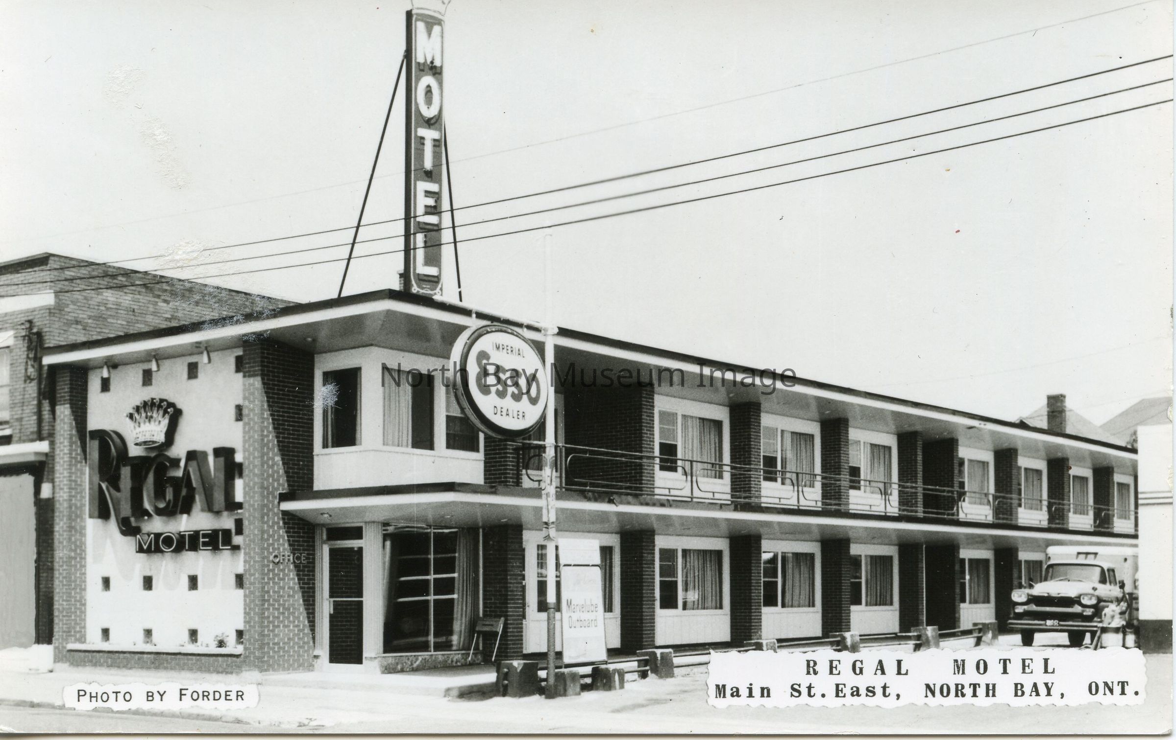 Postcard with B&W photo of Regal Motel on Main St. East. Sign on Main St. Wall of motel includes crown above the word "Regal". Vertical :MOTEL" sign stands on roof.