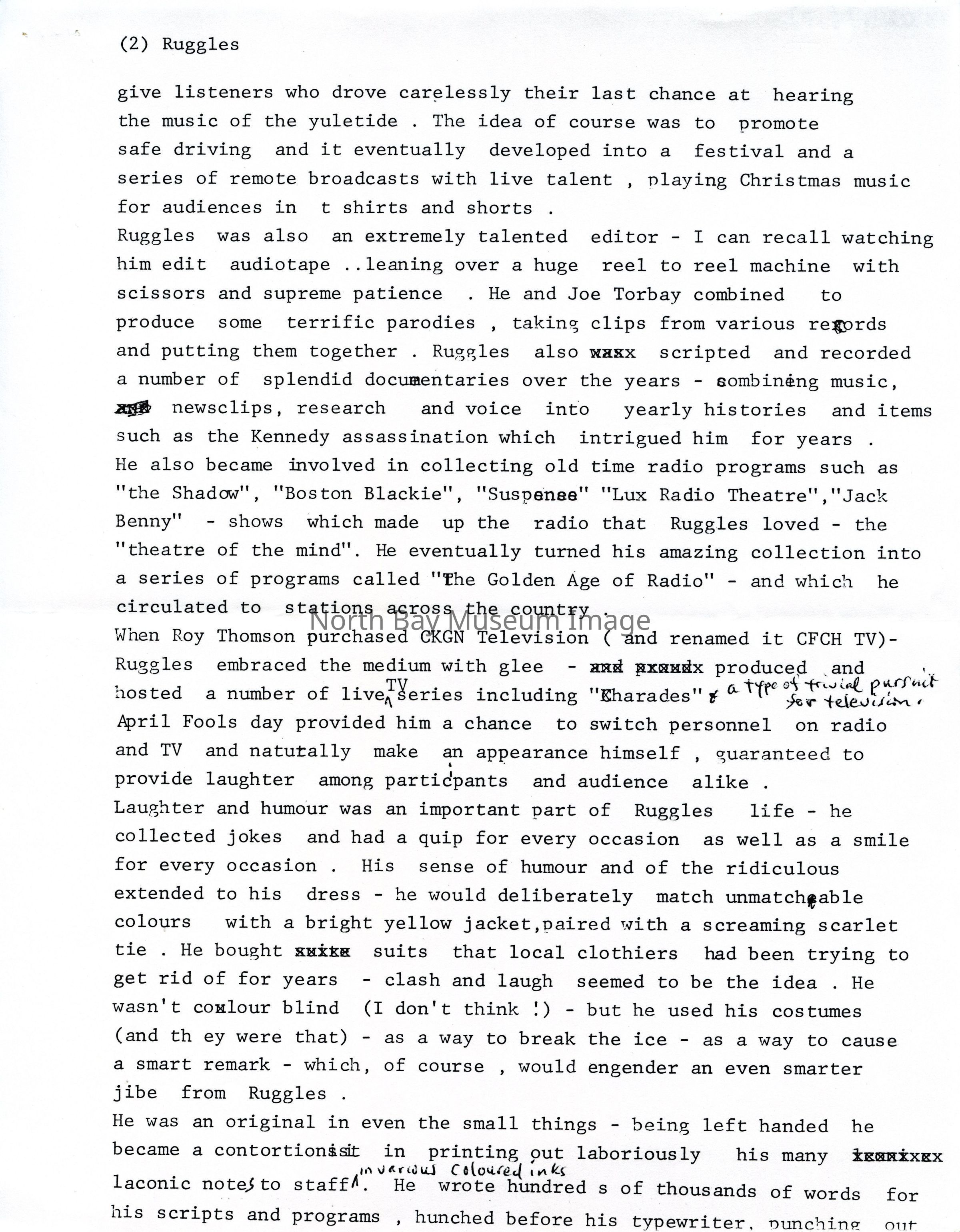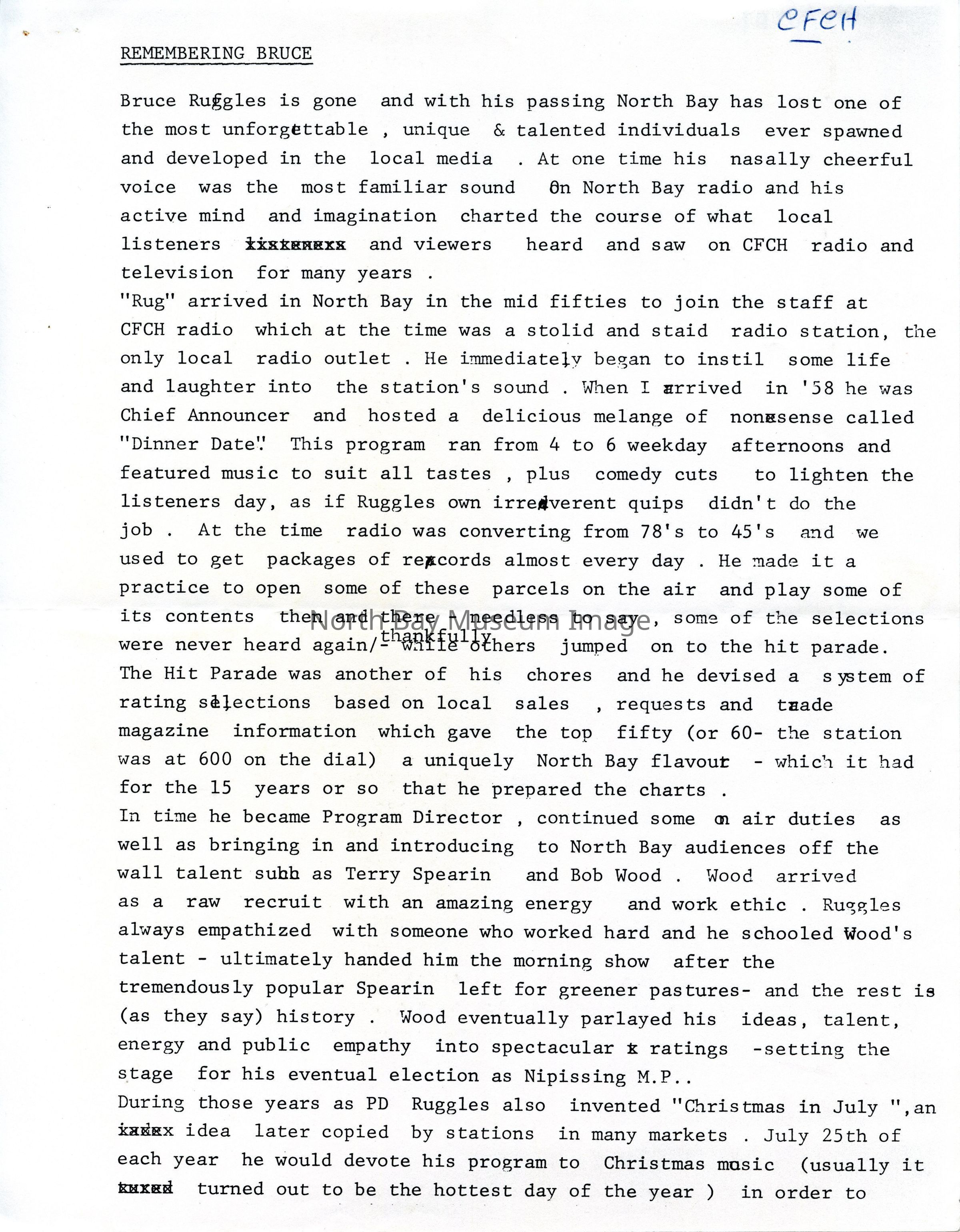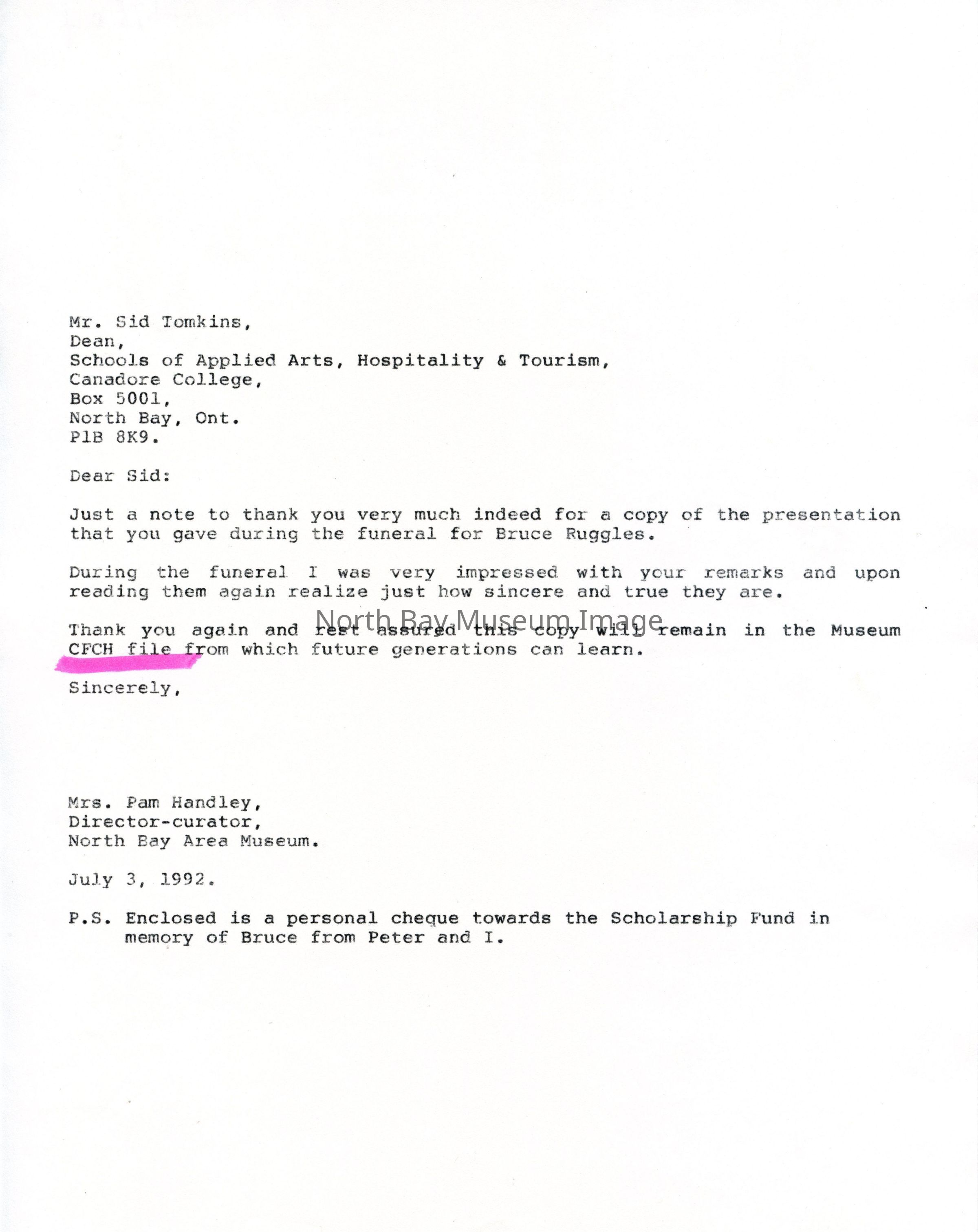 Contents include a document covering and memorialising the history of "Bruce Ruggles", and a letter from Pam Handley to Sid Tomkins expressing gratitude for "a copy of the presentation that you gave during the funeral for Bruce Ruggles". Noteworthy topics include "Bruce Ruggles", "CFCH", "Terry Spearin", "Bob Wood", "Nipissing M.P.", "Joe Torbay", "CKGN Television", "CFCH TV", "Canadore College", "radio", "Sid Tomkins".