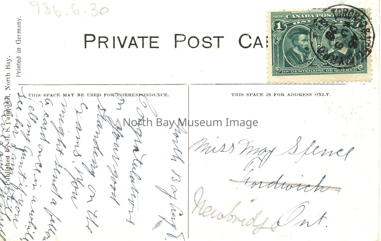 The back of this postcard is addressed to Miss, May Spence, Newbridge, On. There is a message written on back.