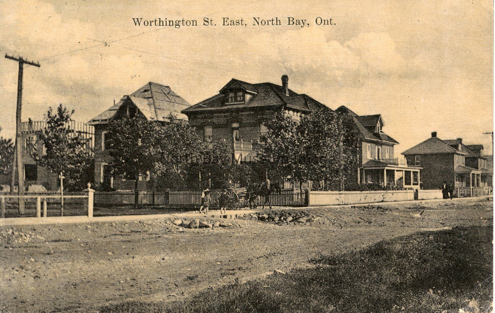 This is a black and white postcard showing Worthington St., East North Bay. The image shows an unpaved road next to a small clearing of land. In the background there is two large 2 storey homes. The front of the postcard has a title in black text that says "Residential Street North Bay" across the top.