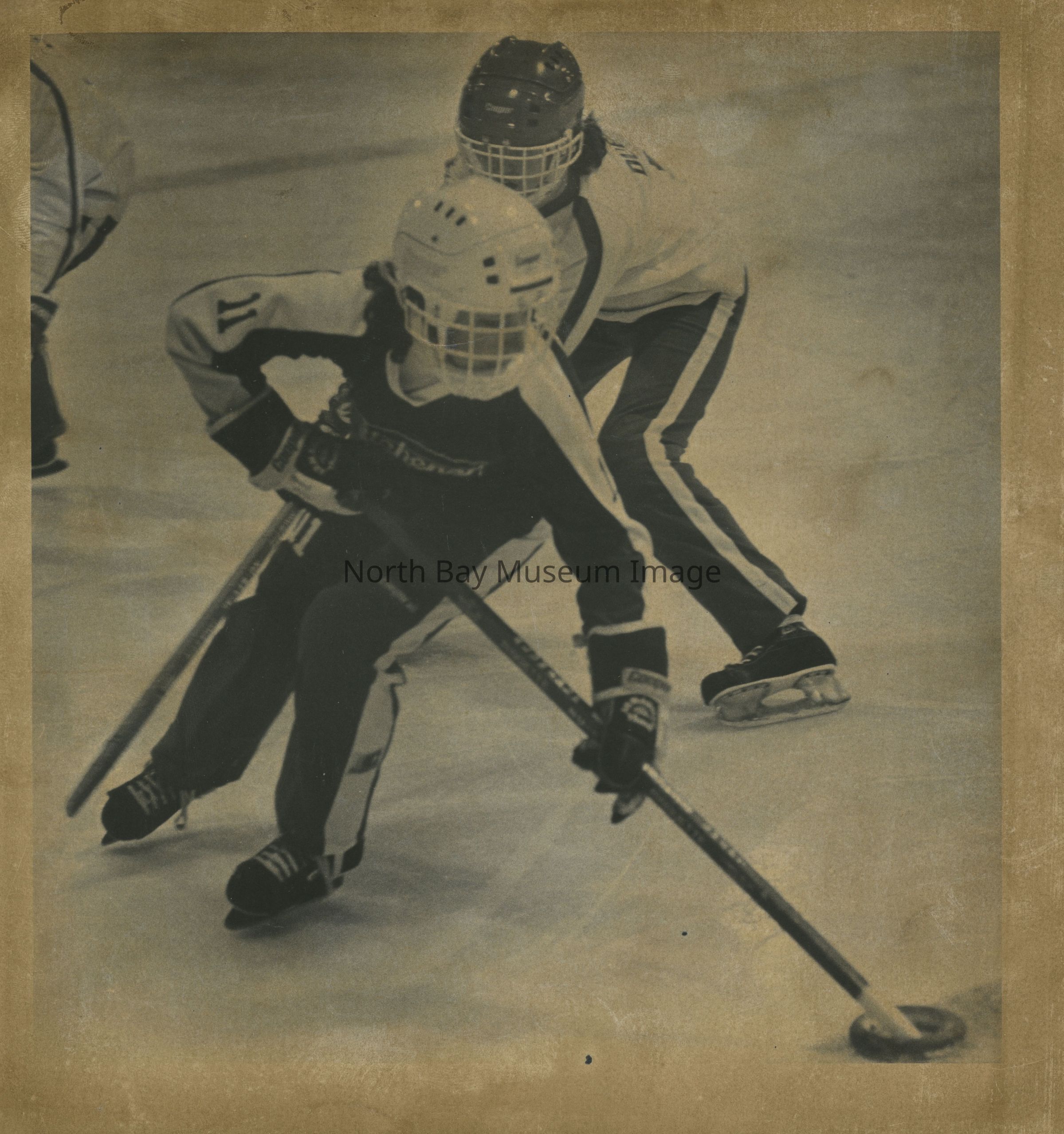 Portraits of Sam Jacks, inventor of Ringette and photo of 1984 Ringette Tournament. See Nugget article: "Ferris Team plays role of good hosts". February 6th, 1984.