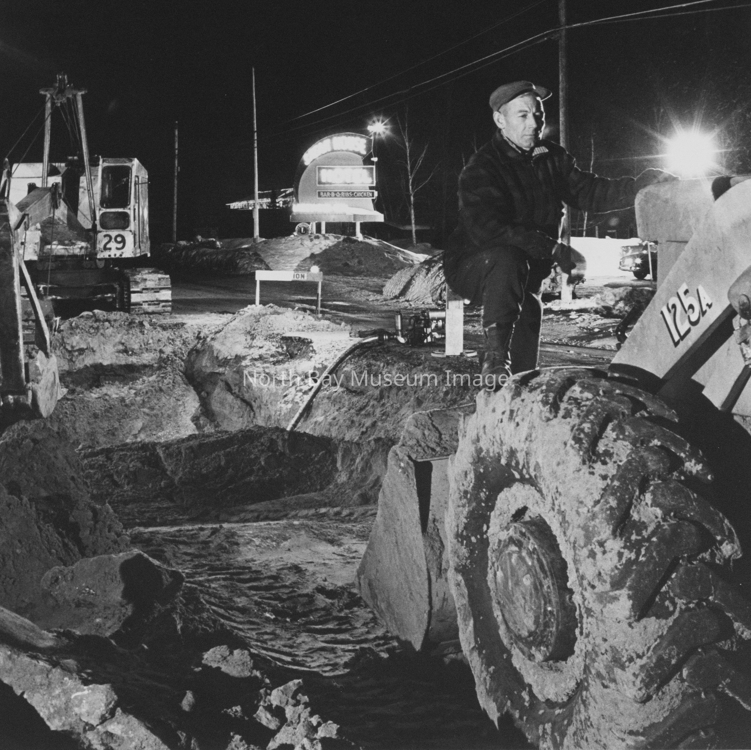 Print is a black and white photograph of roadwork being undertaken at night, with one man pose on a back hoe shovel, beside the Steak House Hotel.