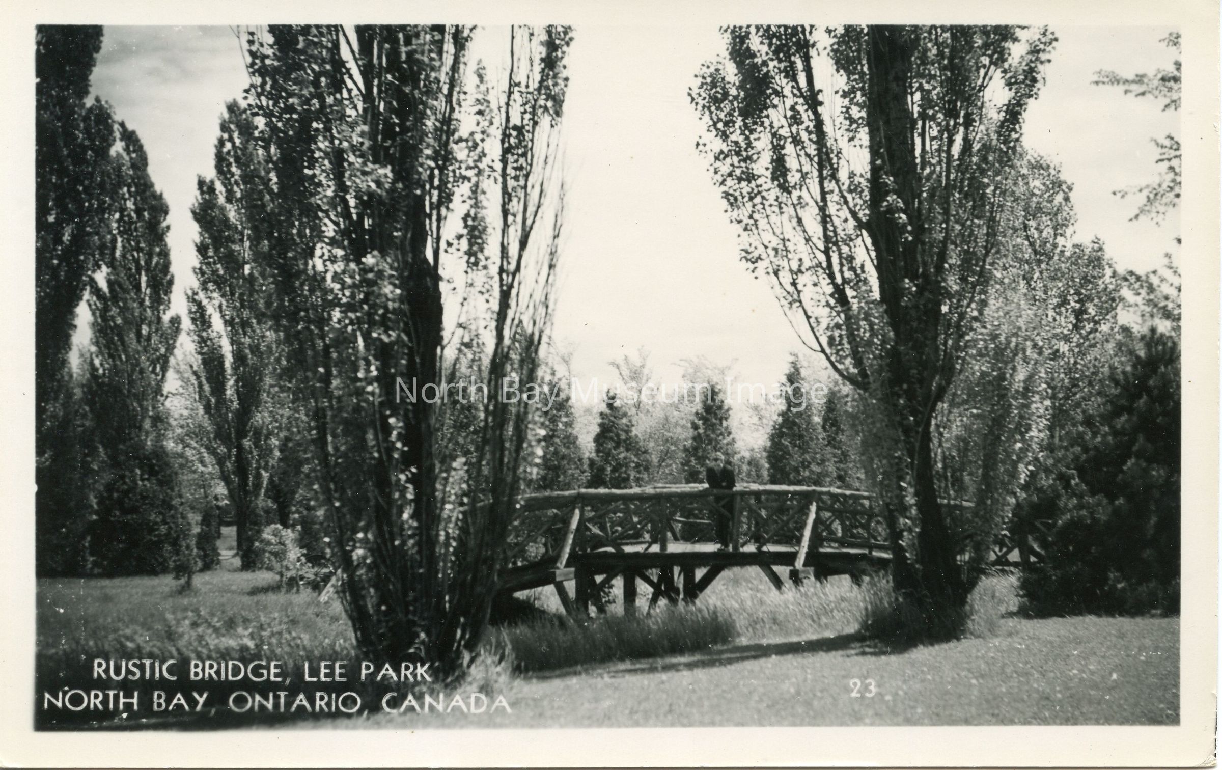 Postcard with photo of rustic timber-built foot bridge in Lee Park, North Bay