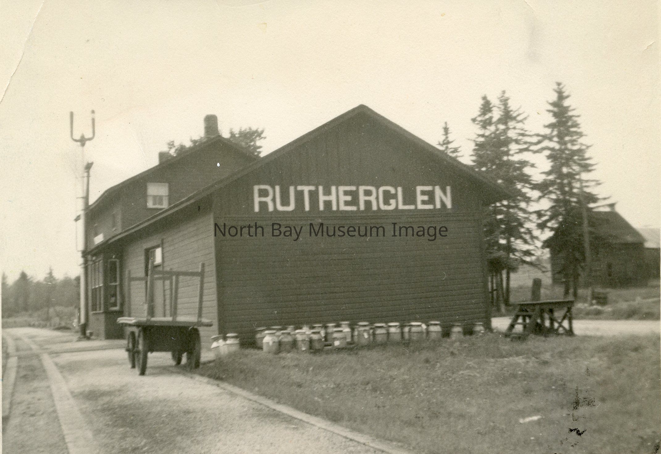 and depicts a Rutherglen Station with Rutherglen in large white letter on side of building.There is a wagon at side of station & milk cans lining the wall.