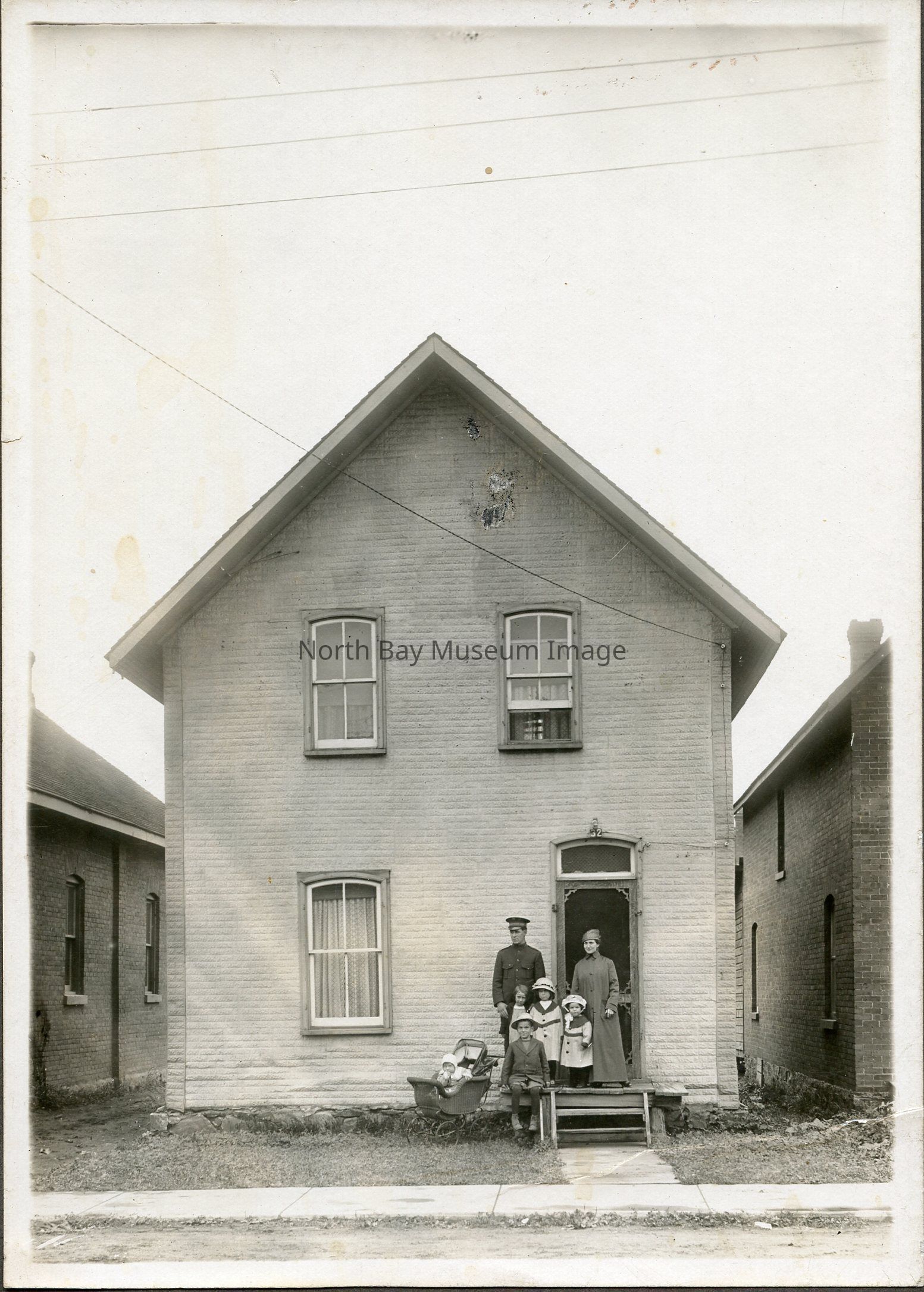 1 photograph, 6.5 inch x 4.75 inch, "Salvation Army Captain with Wife and Family on 32 McIntyre St. East", sometime in 1920's, photograph is on a piece of careboard, 9.5 inch x 7.25 inch. House is on the site of present Salvation Army.Date(s) of Creation
