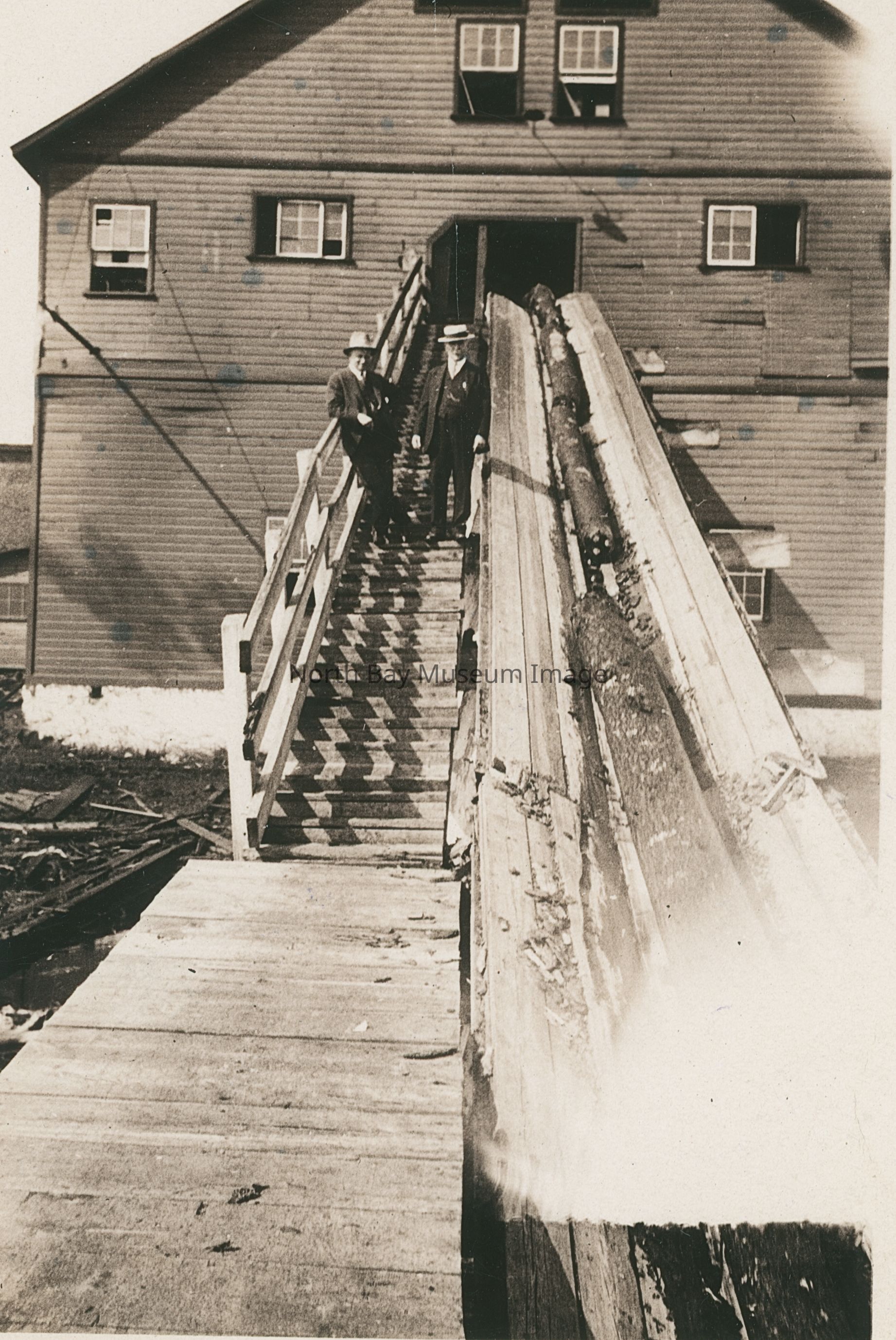 Print, Photographic - black and white photograph - shows sawmill (George Gordon Company, Cache Bay) with logs coming up conveyor belt - George Gordon and another man are standing on the walkway beside the conveyor belt