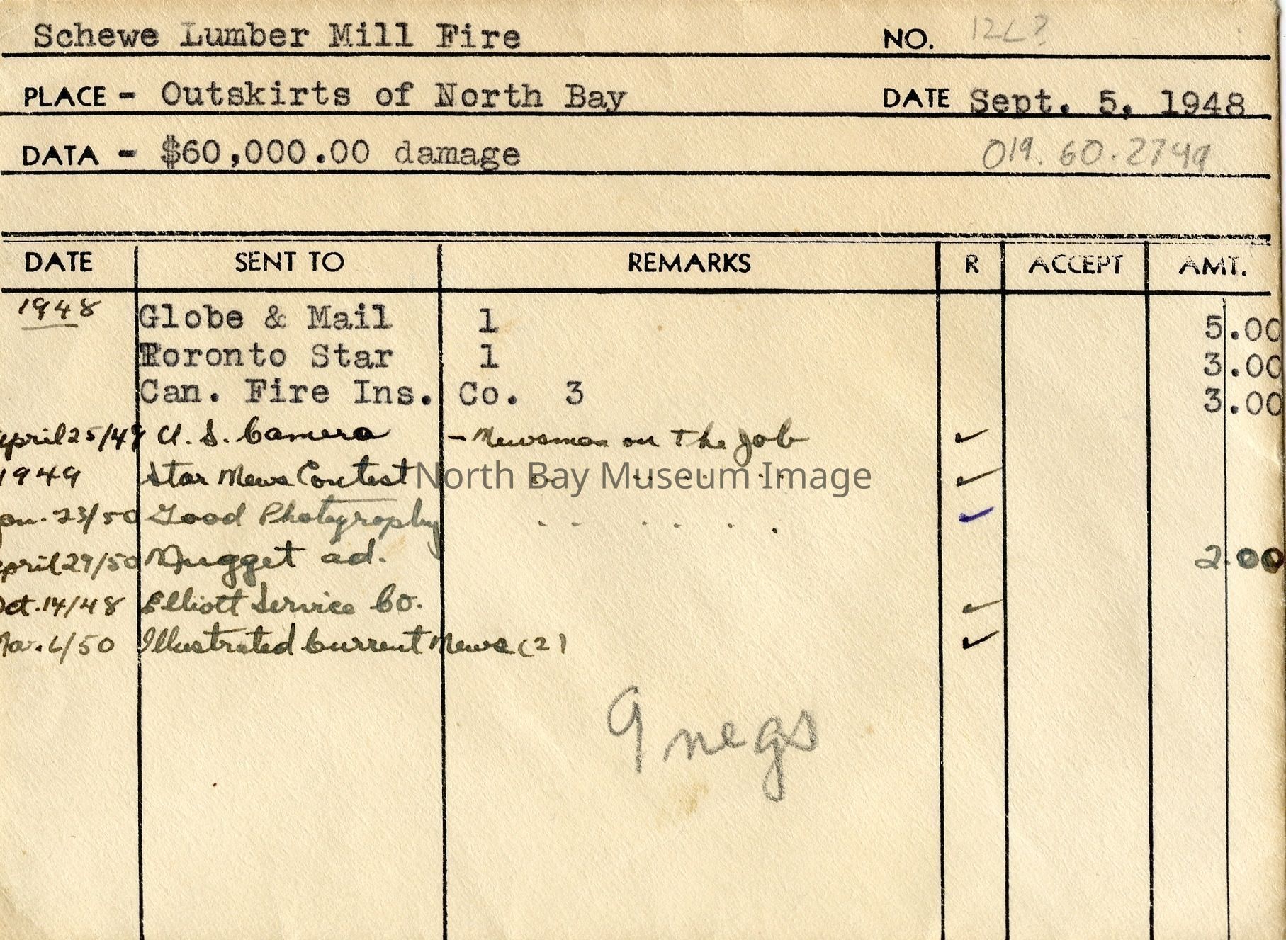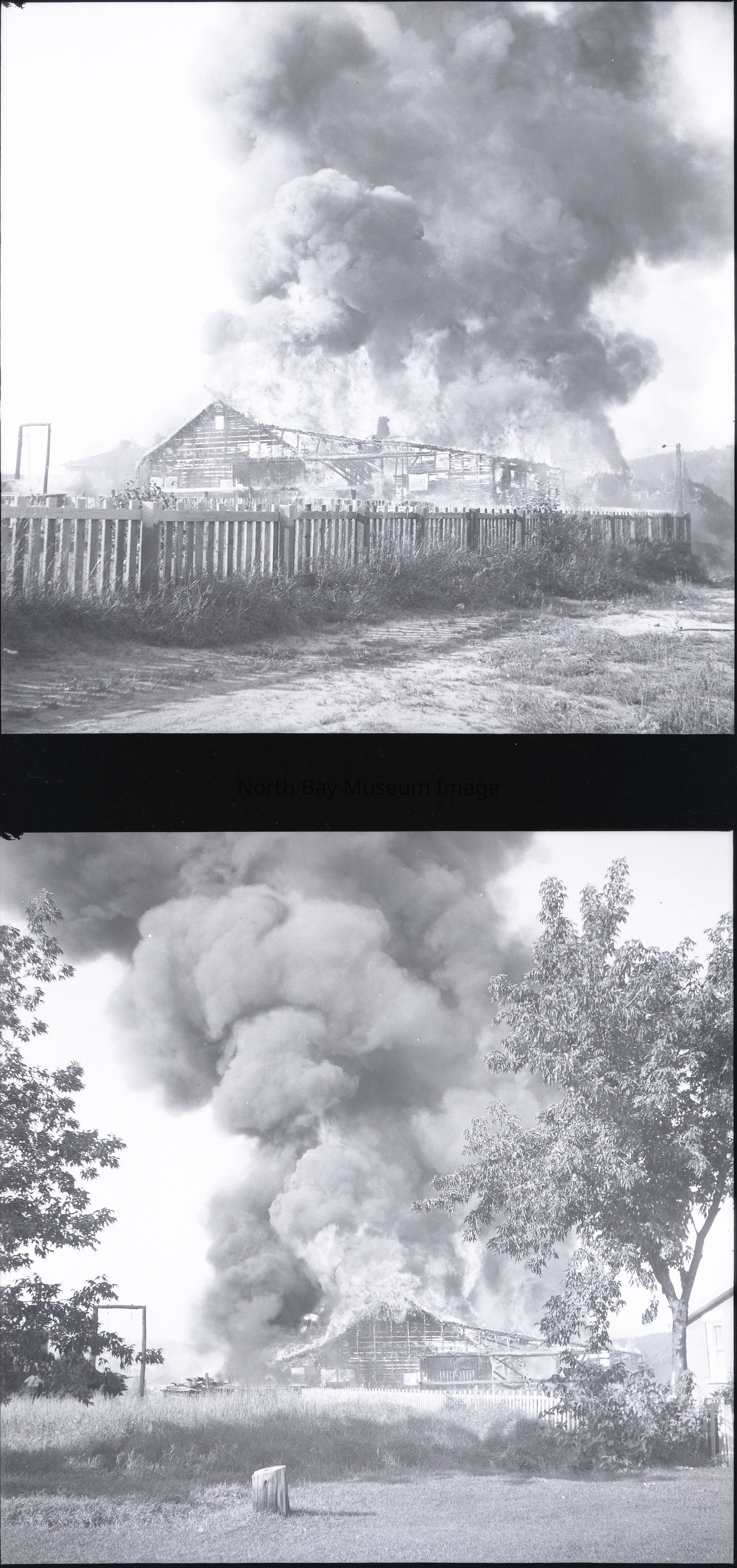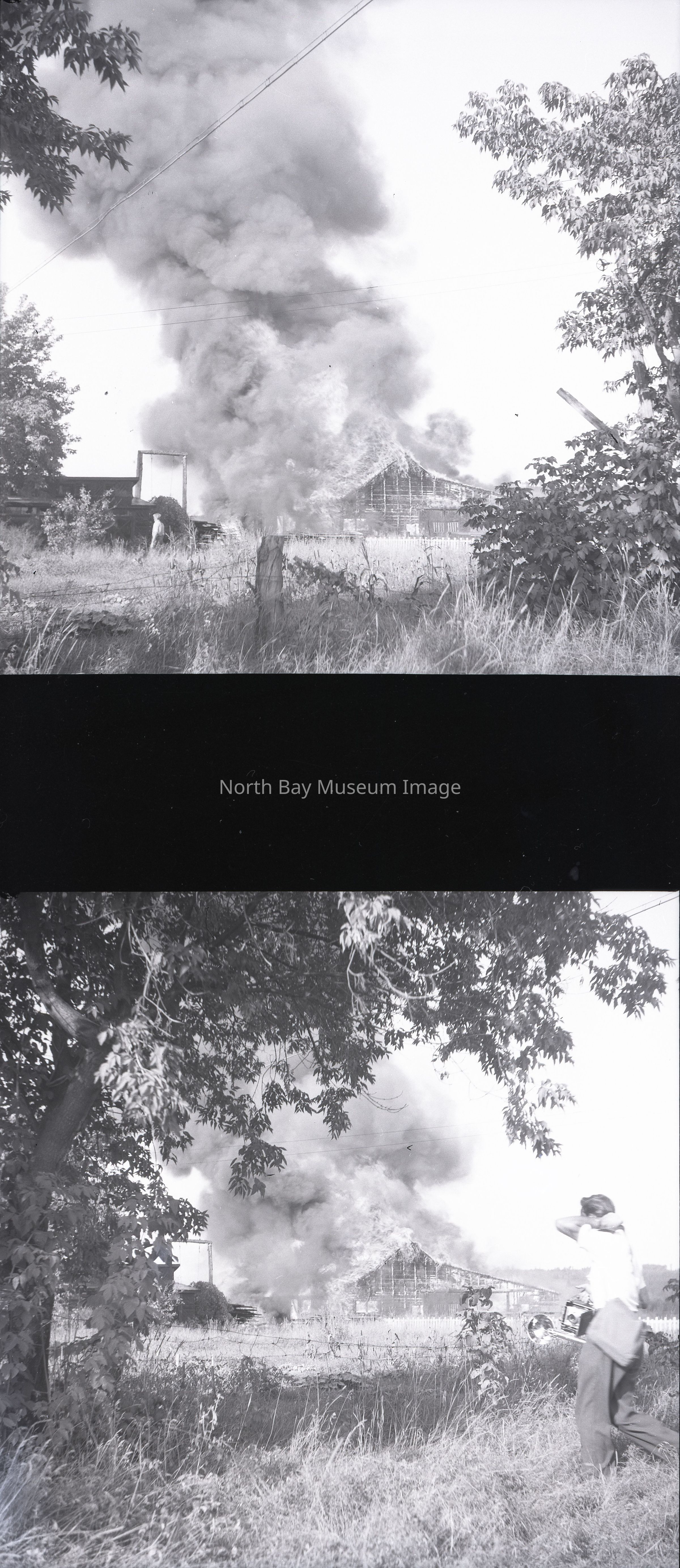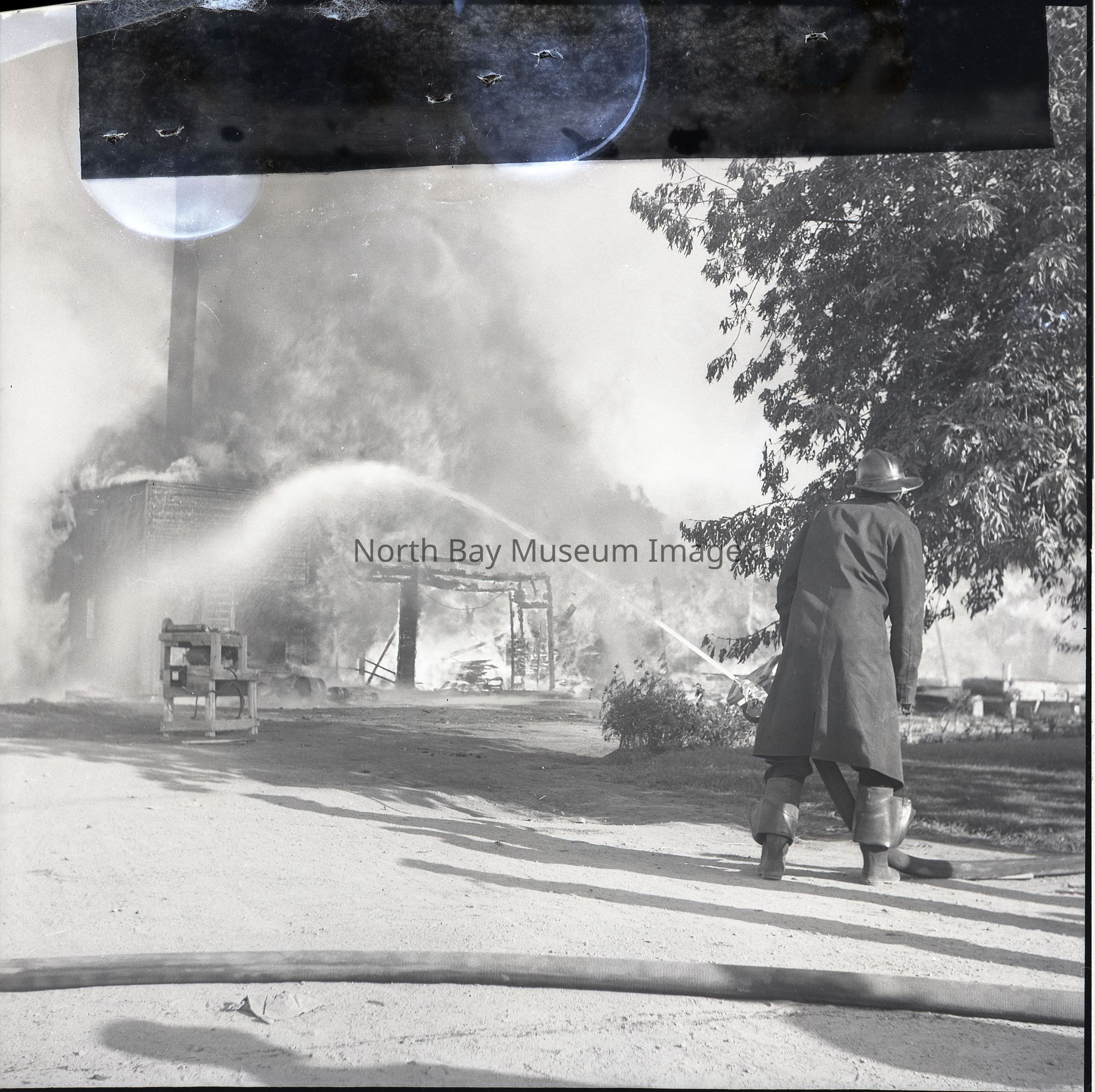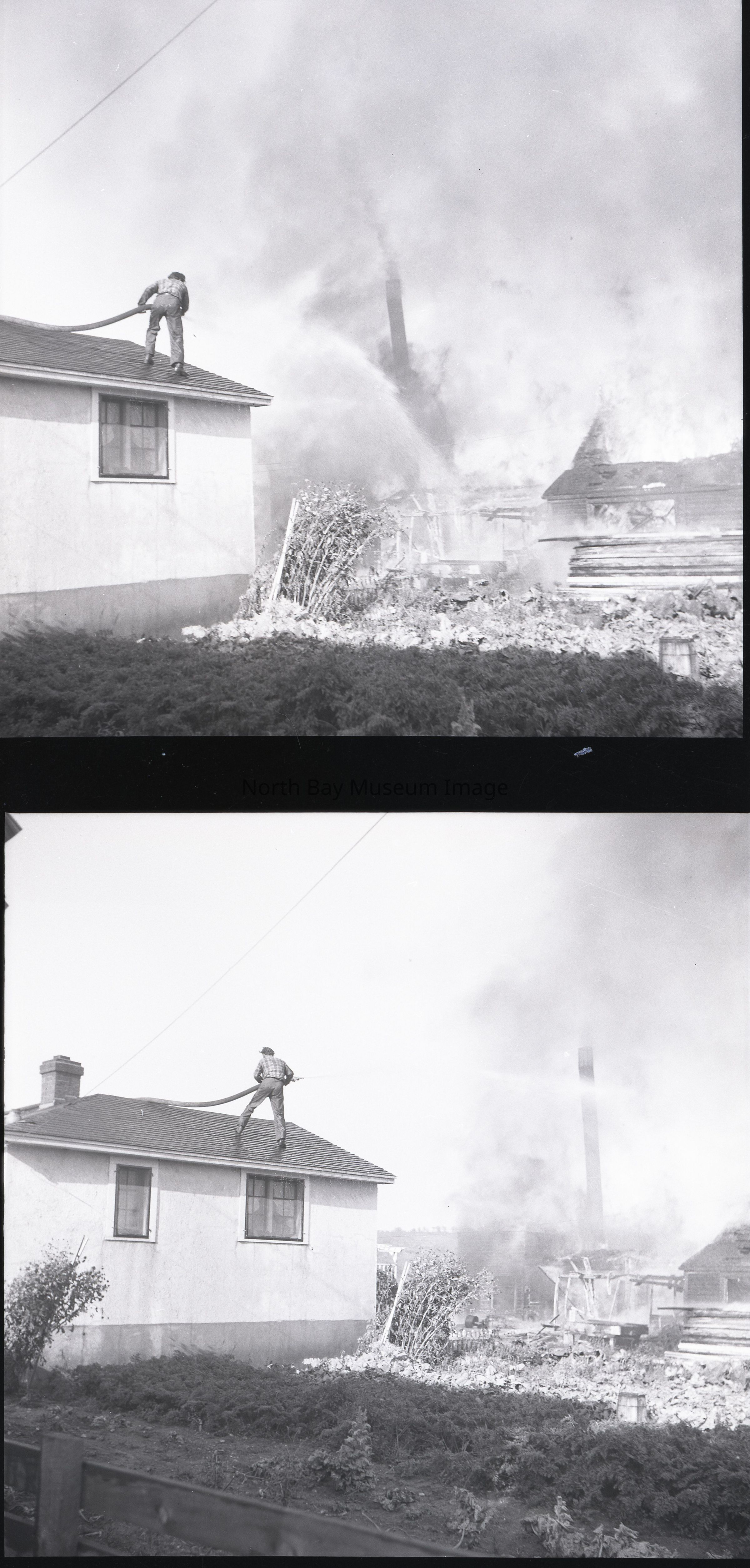 Envelope (a) contains the photographs and negatives (b-f) of a lumbermill fire at Schewe Lumbermill. Photographs are by William Forder with his notes on the envelope where negatives were kept. Negatives depict the structure from a distance with smoke rising taken from various angles. e- depicts a firefighter on the roof of the structure. F depicts a firefighter standing on the road spraying water at the building.