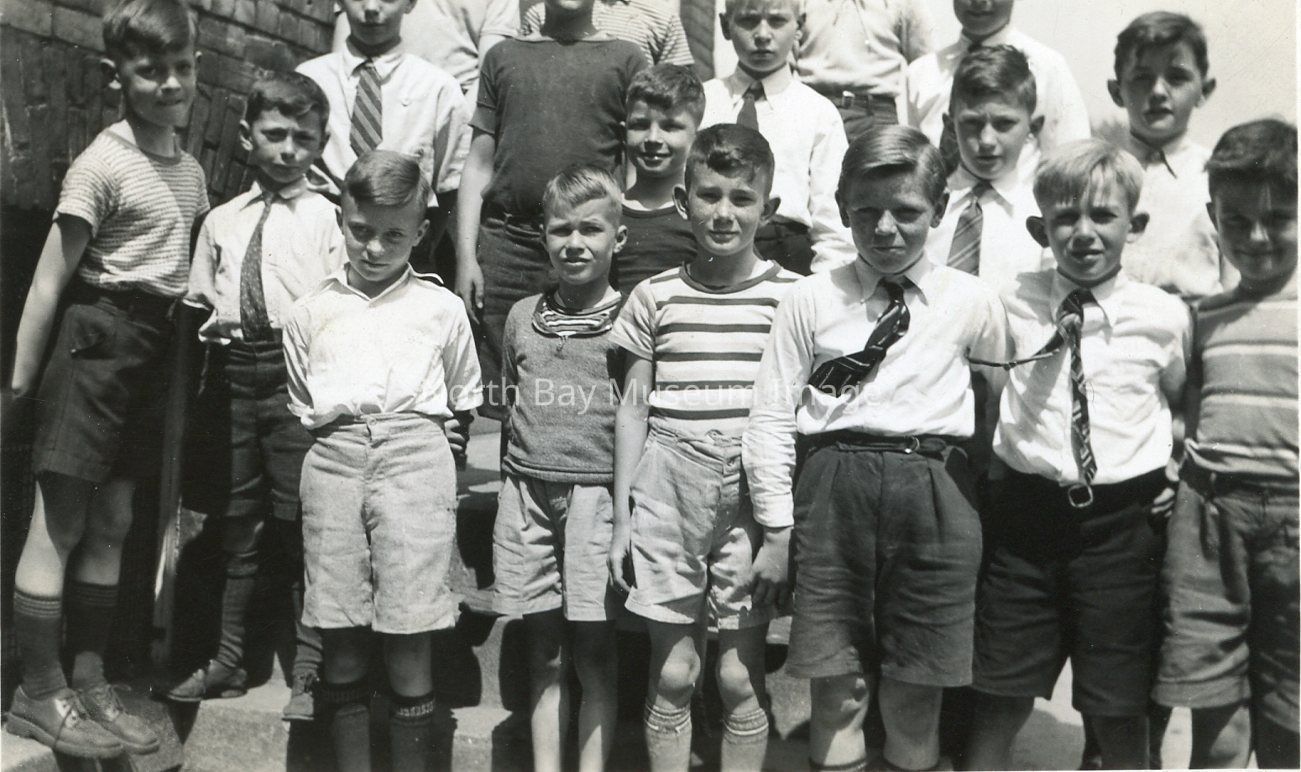 Black and white photographic print of group of boys from Harvey Street School (King George) taken in 1940's. The names of students "Donna, Linton and Teddy" are written on back of print.