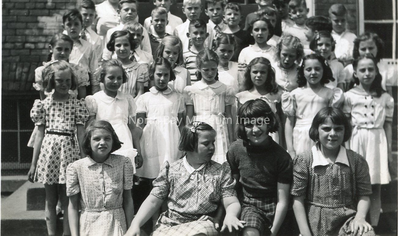 Black and white photographic print of class photo from Harvey Street School (King George) taken in the 1940's. The names Donna, Jean and Kelly are written in pencil on back of print.