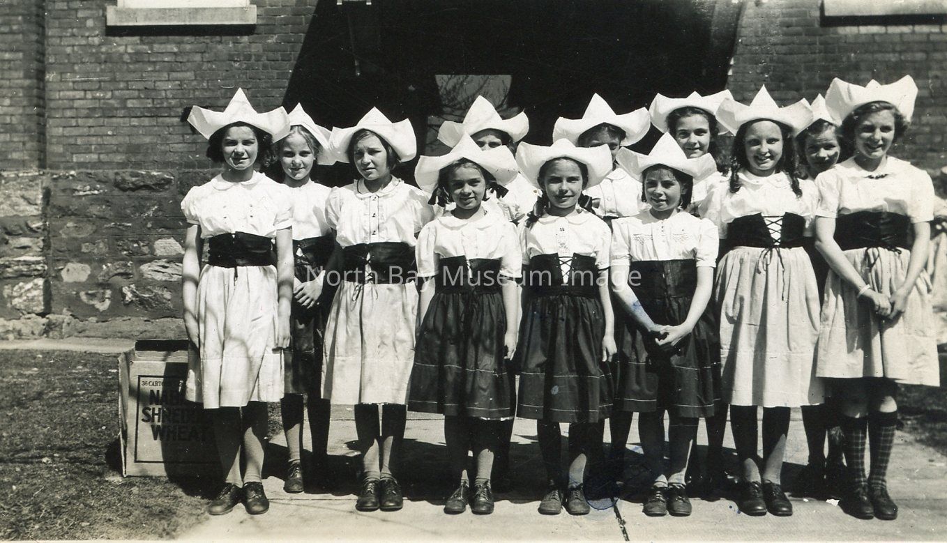 Black and white photographic print of McIntyre Street School students dressed up in Dutch costumes for a play