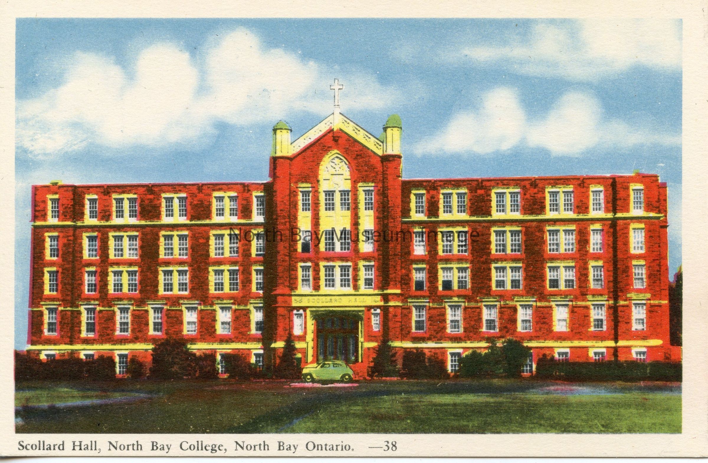 Postard with hand-colored photo of Scollard Hall school building, 5-story grey brick building. Stones are grey brick, not red as appear in this photo