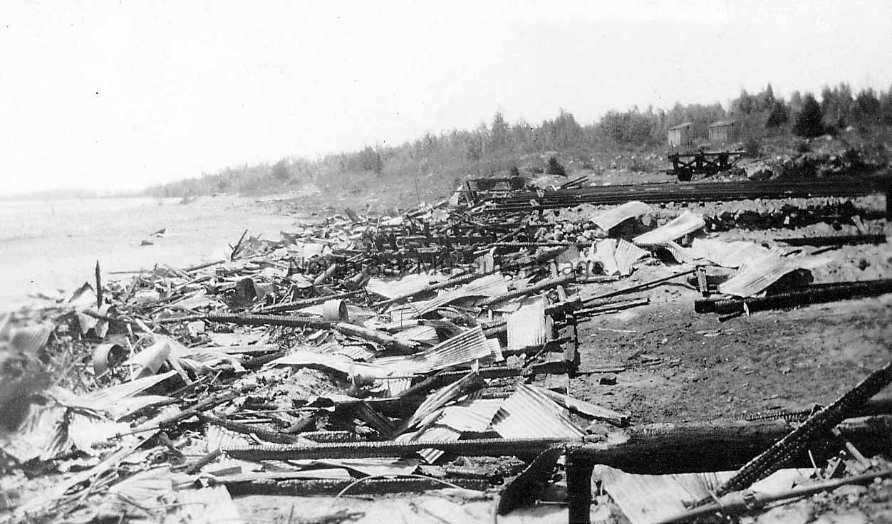 Black and white photographic print of John B. Smith & Sons Ltd. Image is of remnants after fire destroys first lumber mill in Callander.