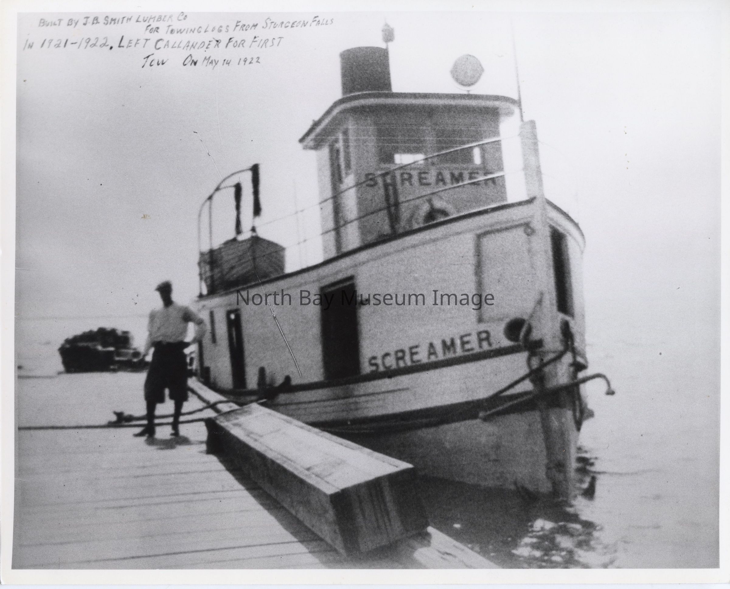 In left hand corner "Built by J.B. Smith Lumber co. for lowing logs from Sturgeon Falls Left Callander for first tow on May 14 1922. Copy of photo.