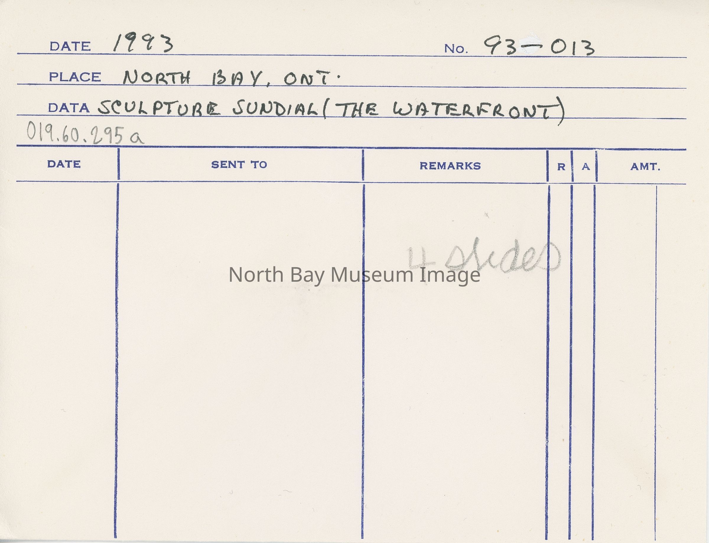 Envelope (a) contains slides (b-e) of SunDial Sculpture at the North Bay Waterfont in 1993.