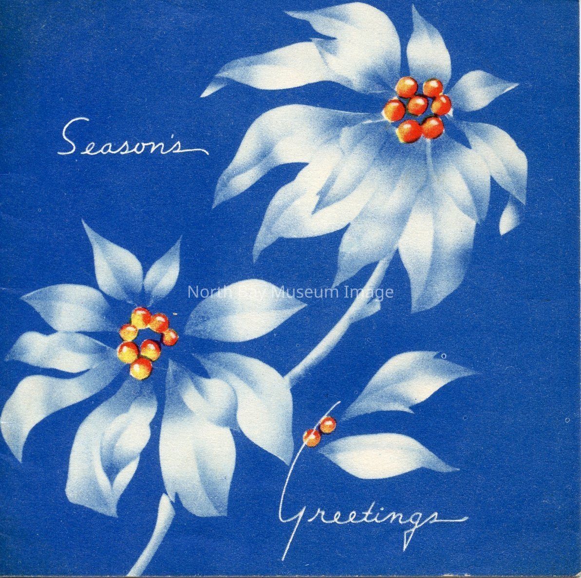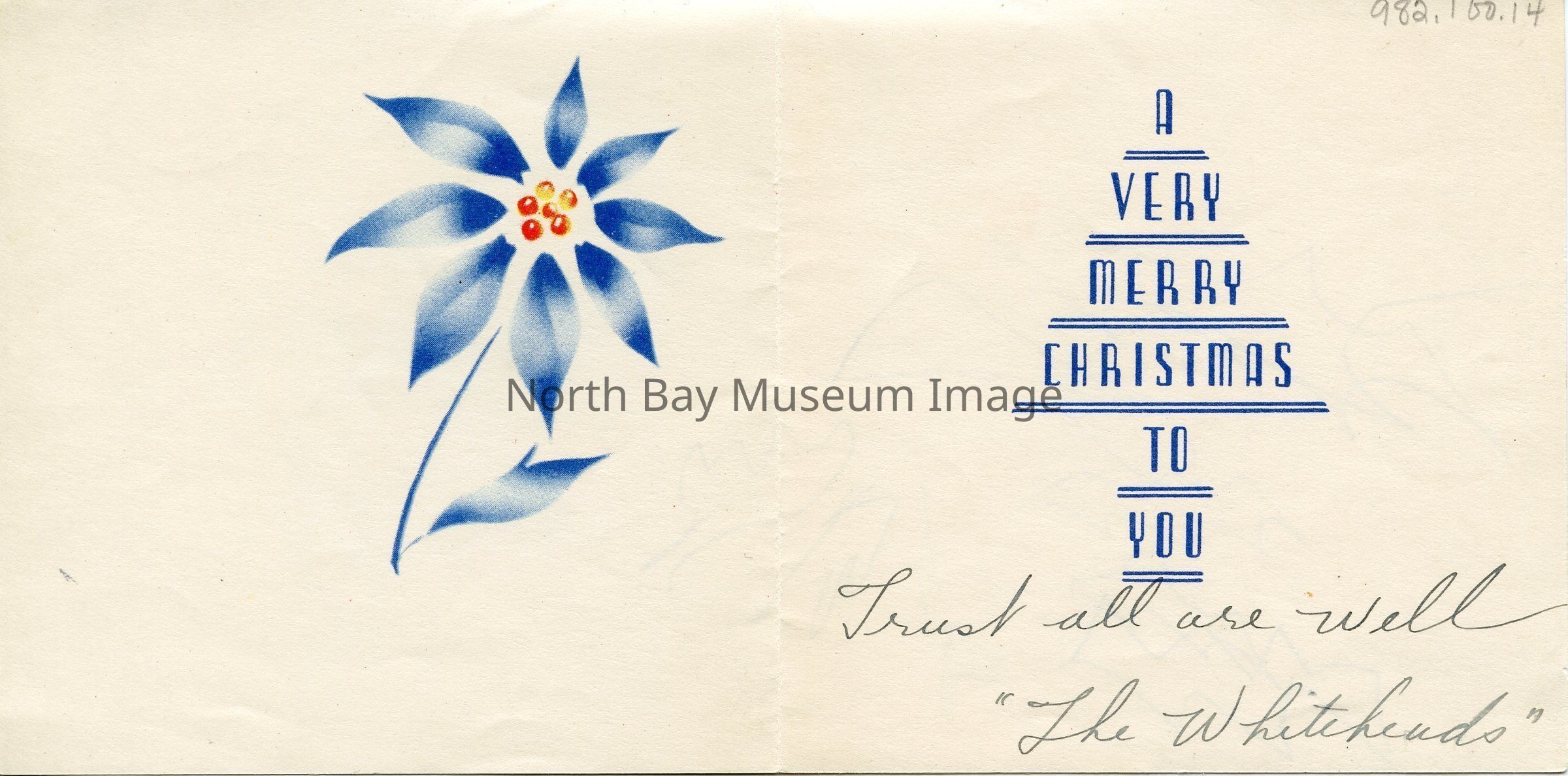 This is a blue Christmas card. On the card is pictures of white poinsettias. The card reads "Season's Greeting." On the inside the card reads"a Very Merry Christmas To You - Trust all are Well The Whiteheads"