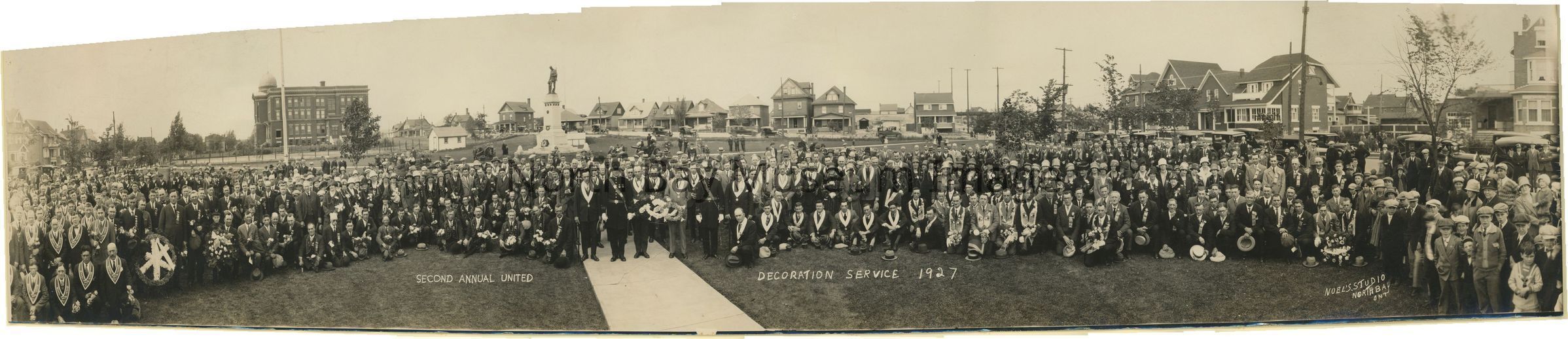 1 black and white photo of Second Annual Decoration Service 1927, taken at Memorial Park with Cenotaph and Normal School or teacher's college in background, this belonged to donor's father Robert Stenning who lived in North Bay about 50 years, worked at ONR as a signcoviter. 27 inch longCreator