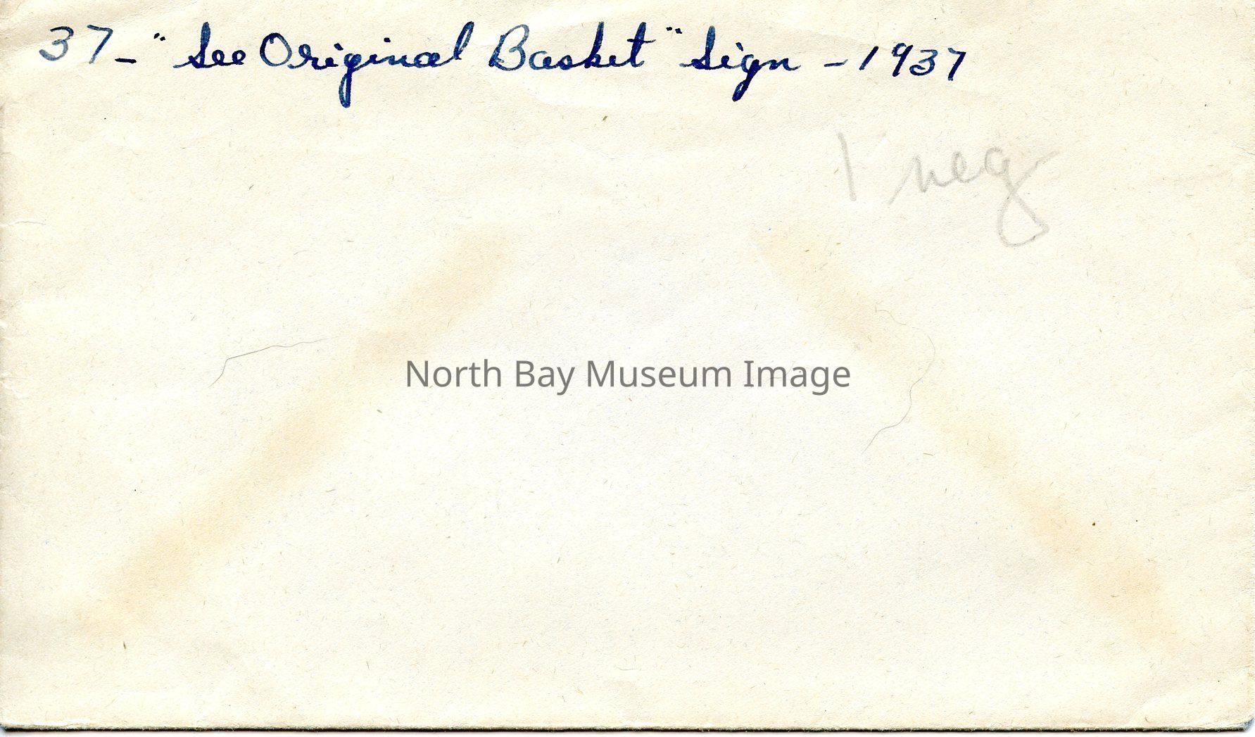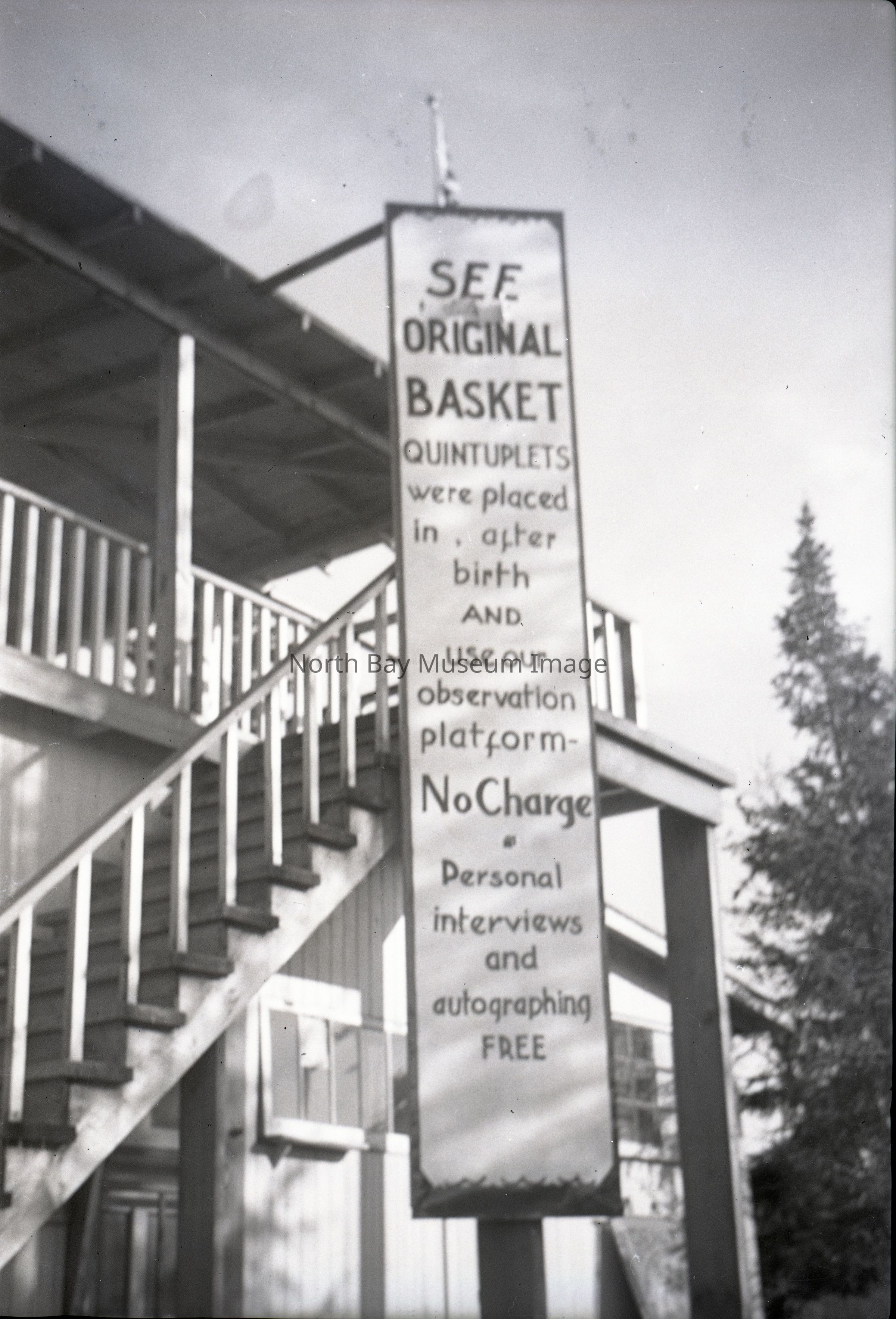 Envelope (a) contains the negative (b) of the "See Original Basket" sign. The sign is promoting tourists and visiters of Quintland to see the basket that the Dionne Quintuplets were placed into right after birth, free of charge. A part of the Forder Collection.Creator