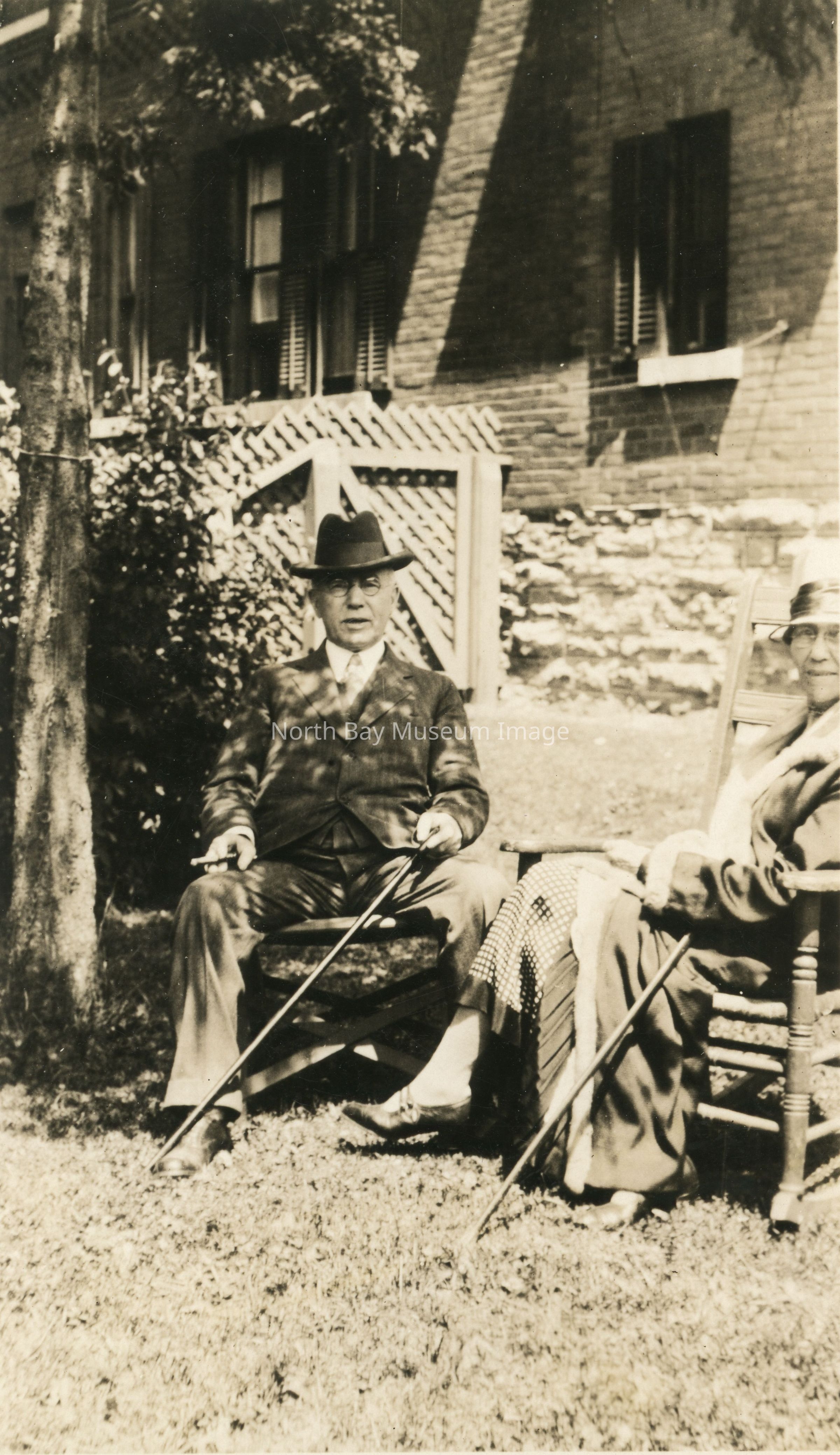 Black and white photograph that shows Senator George Gordon and Bella Booth seated in chairs on lawn with house in background. Senator Gordon is wearing hat, glasses, smoking a cigar and holding a cane.