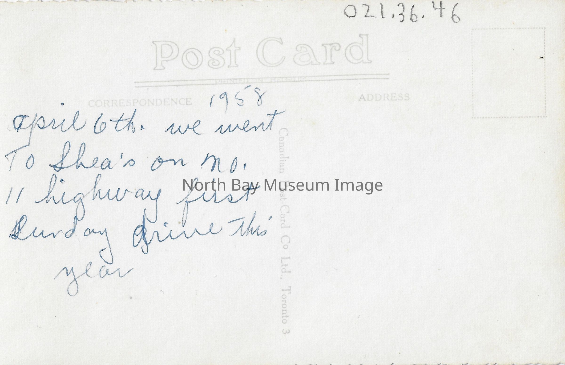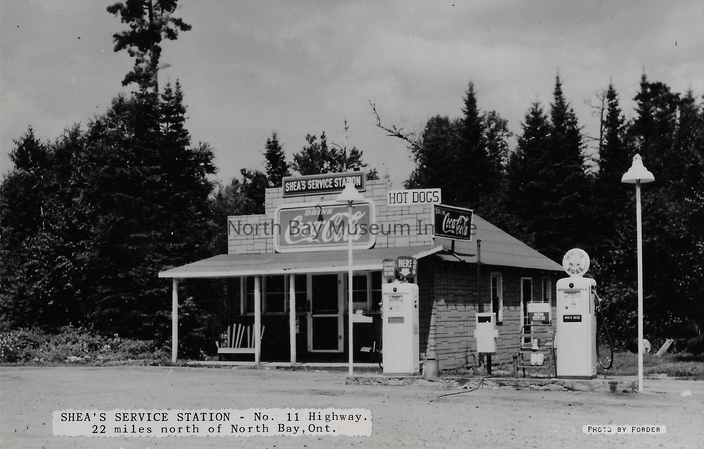 This is a black and white postcard. The card is of a brick Service Station Building. A Coca Cola sign is visible on the top of the building, as well as a sign advertising for hot dogs is also visible. There is a small gas pump to the side of the building. "Shea's Service Station - No.11 Highway. 22 miles north of North Bay, Ont." Inscription on Back: "1958 April 6th. We went to Shea's on no. 11 highway first Sunday drive during this year."