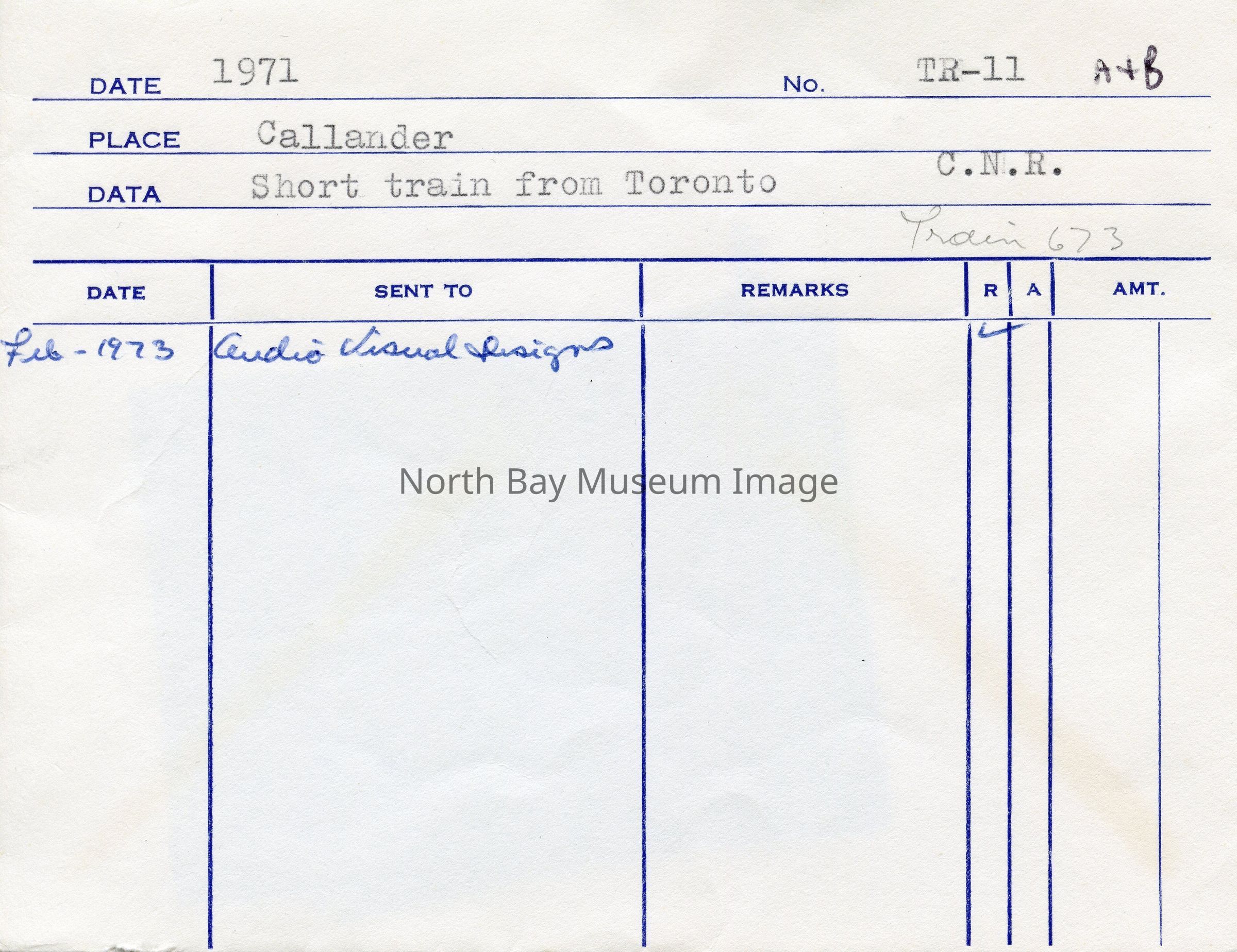 Inscriptions on a (photographer's original envelope include "1971", "TR-11 A+B", "Callander", "Short Train from Toronto", "C.N.R.", and "Train 673". Forder put the item(s) in this envelope, so contents have original order.