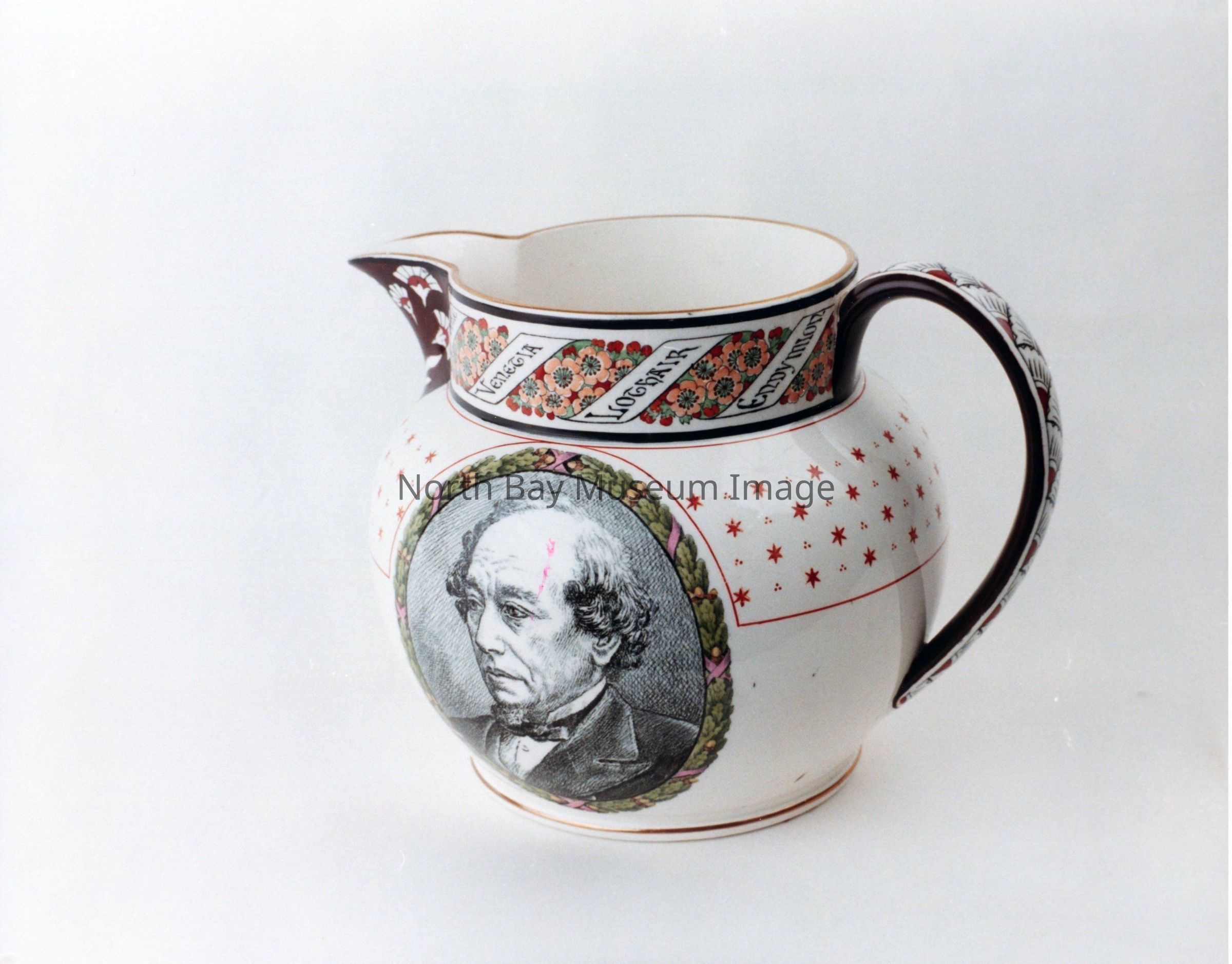 - side view with picture of Disraeli, white with red stars, flowers and writing around top of jug and handle