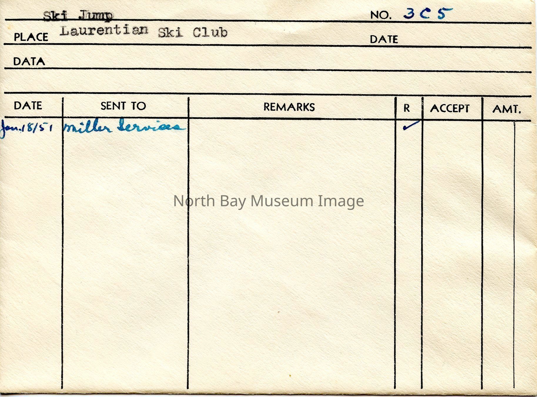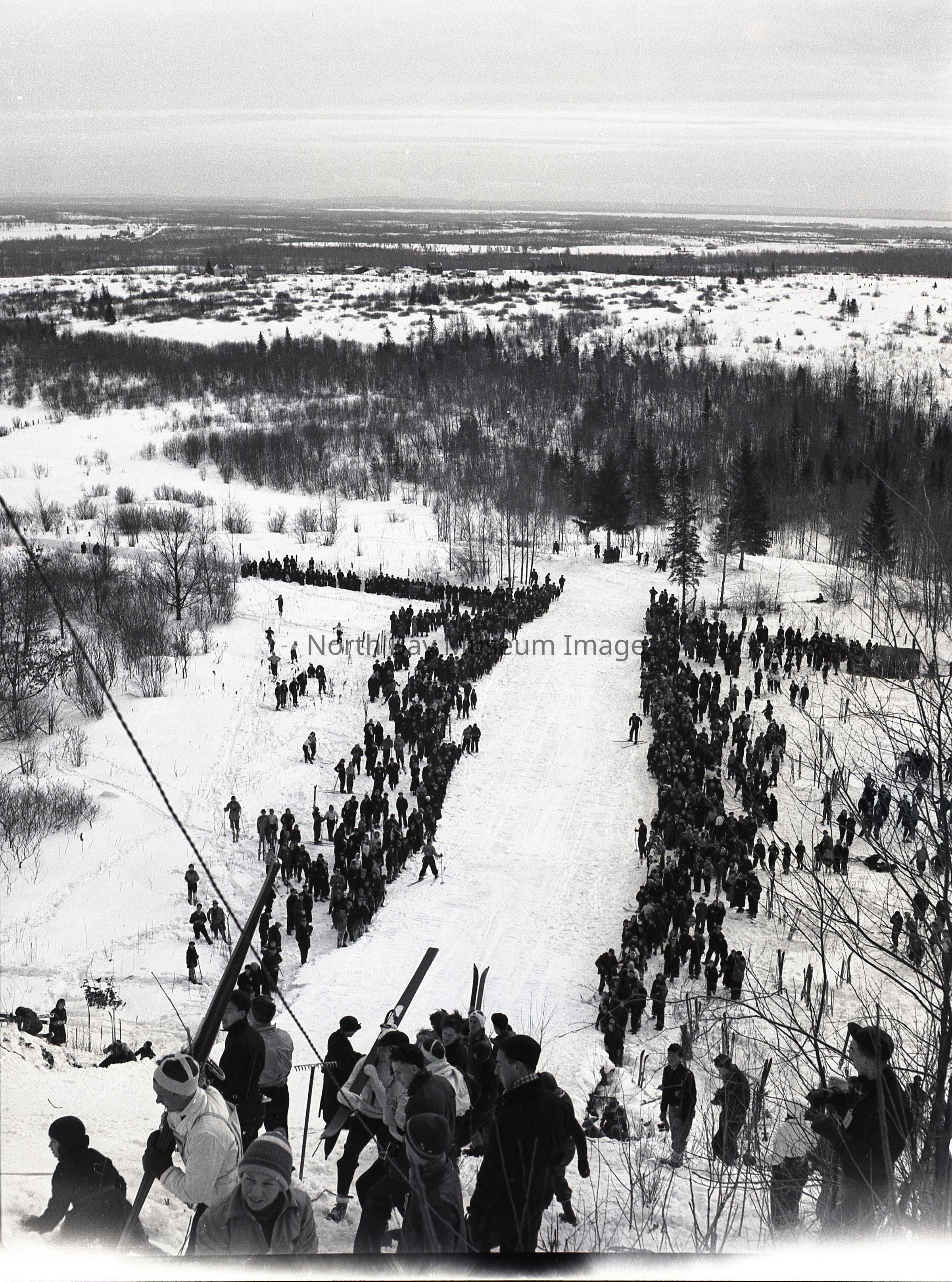 Envelope (a) containing negative (b) a ski jump at the Laurentian Ski Club. The image is people lining up to ski down the hill/ski jump down the hill. There is both a lot of people lining up to ski and people waiting below the hill looking and watching skiers jump on either side of the path. A part of the Forder Collection. The photographers original number is 3c5. All of the photographs publications are listed on the the envelope.Creator