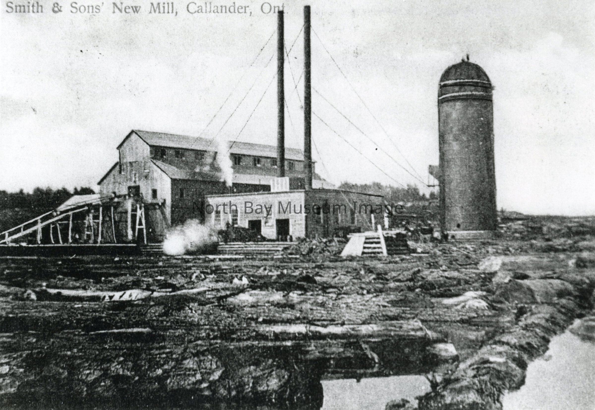 Copy of black and white photographic print of John B. Smith & Sons Ltd. saw mill in Callander. The words "Smith & Sons' New Mill, Callander, Ont." are printed into the upper left corner of the image