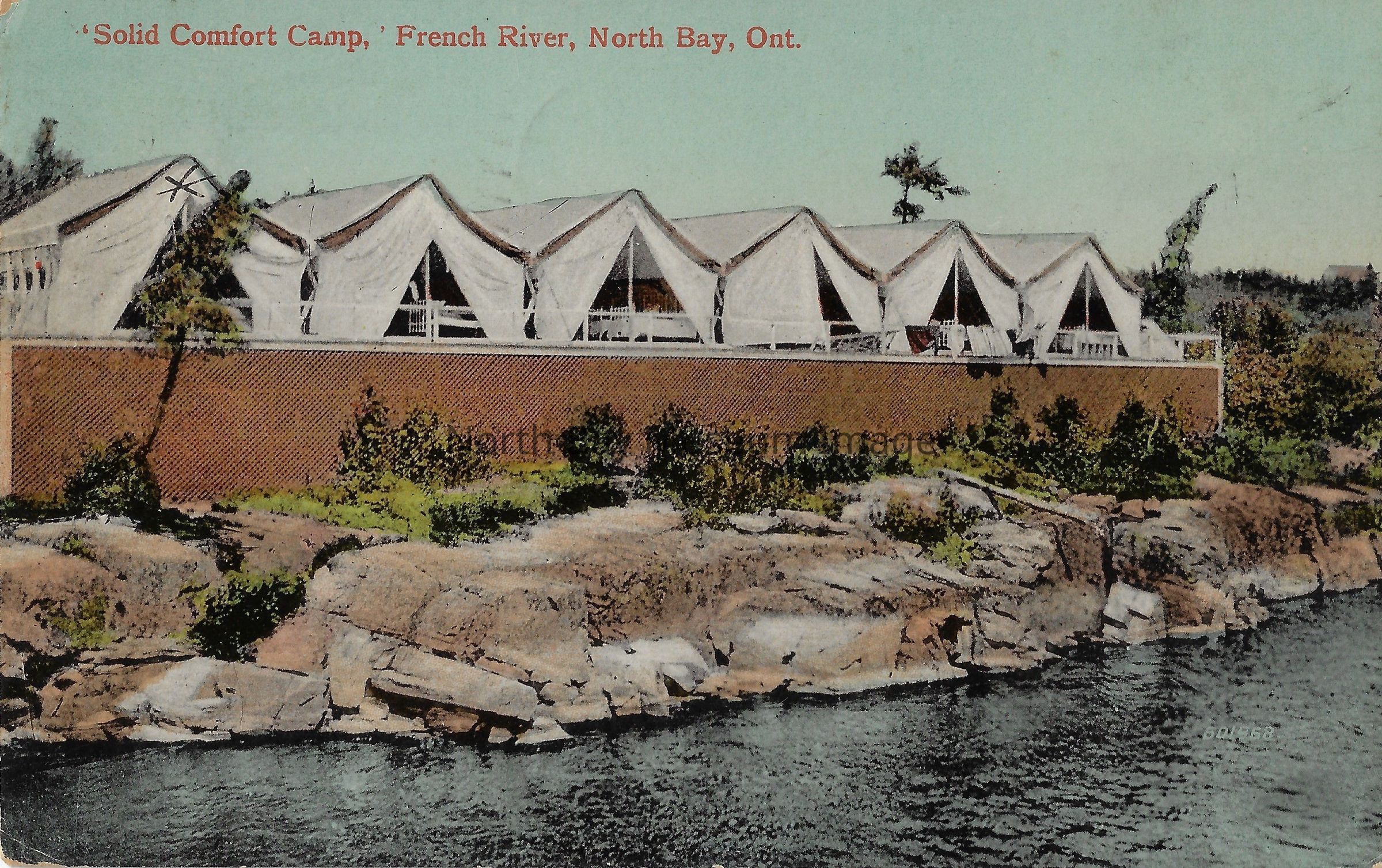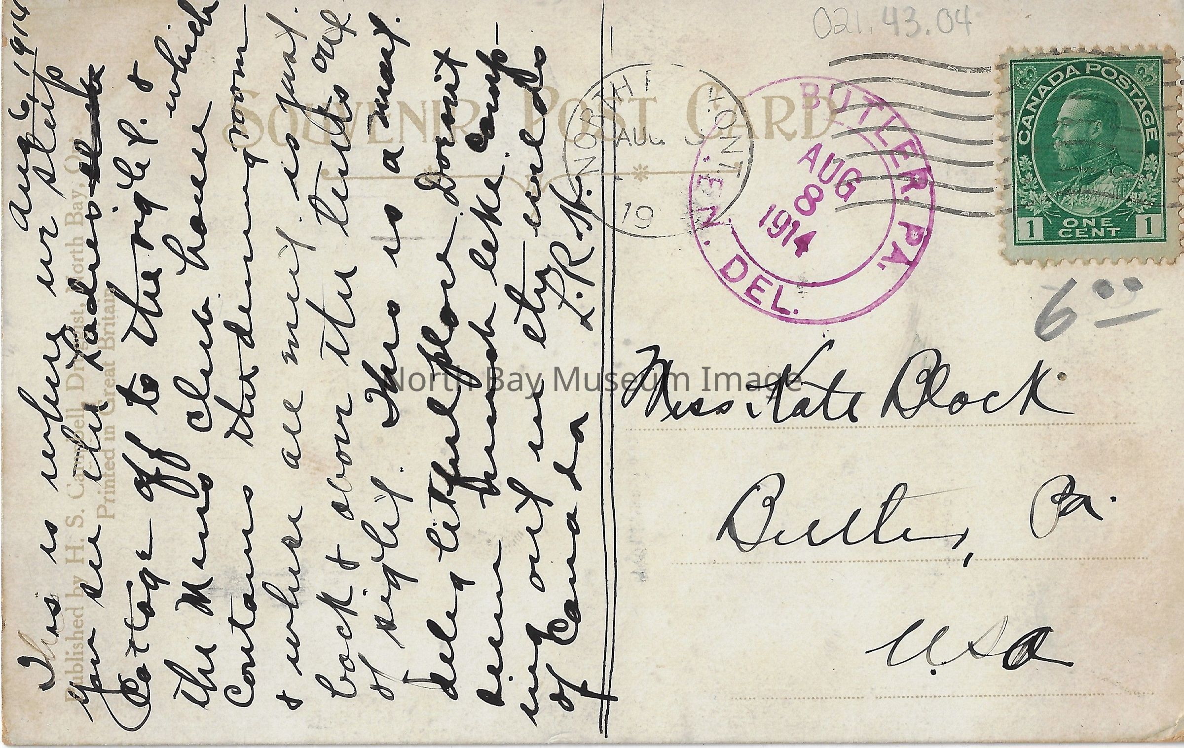 Colour postcard with illustration of Solid Comfort Lodge/Camp on an island on the French River. Many people from Nipissing First Nation have worked at and around this lodge and naturalists from the Carnegie Museum are also connected to the history of the lodge. On the back of the postcard written is "Published by H.S. Campell Druggist, North Bay, Ont. Printed in Great Britain." and "Souvenir Post Card". Purple stamp written "Butler. PA. EN. DEL. Aug 8 1914" including a green one cent stamp.Creator