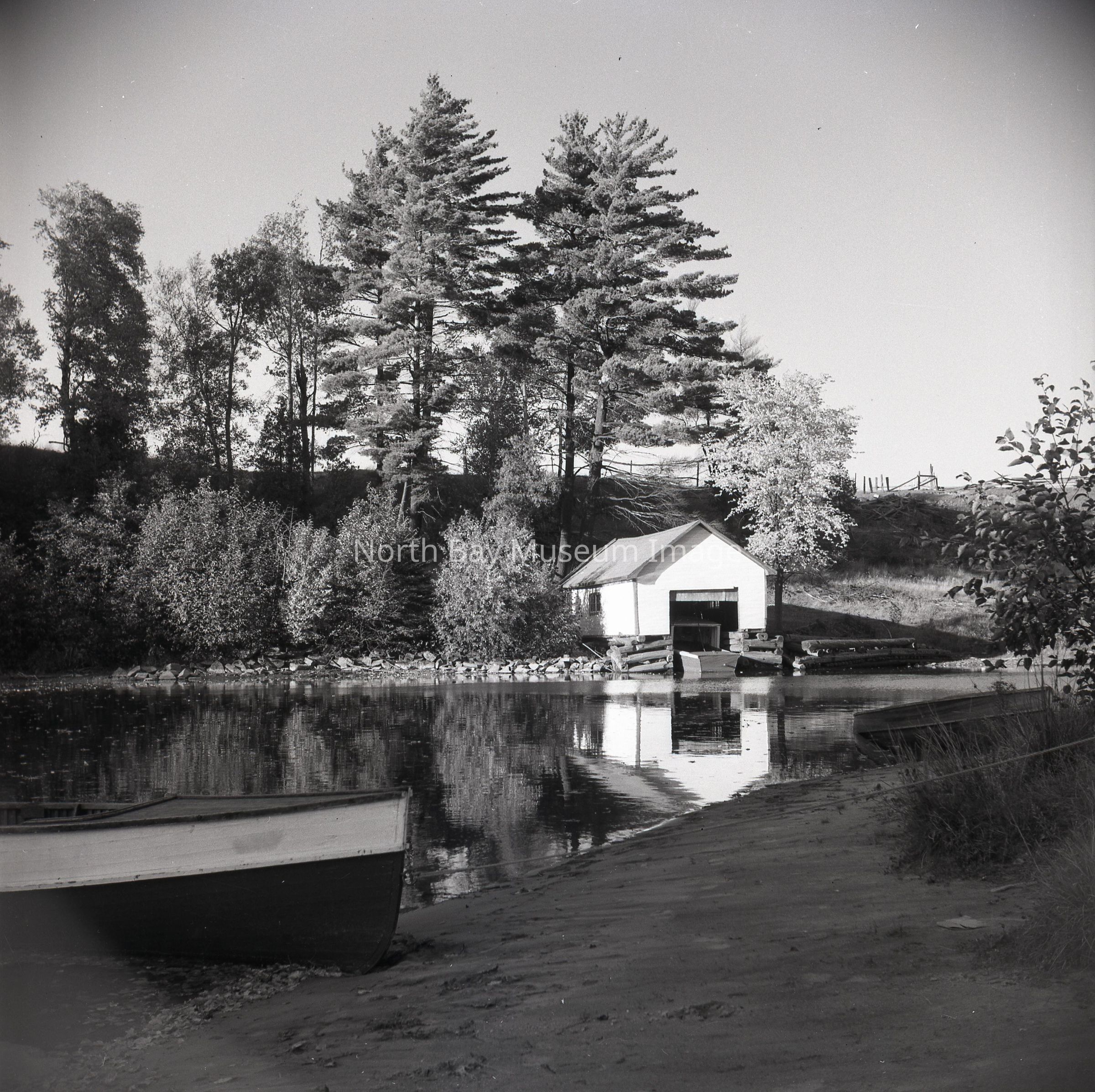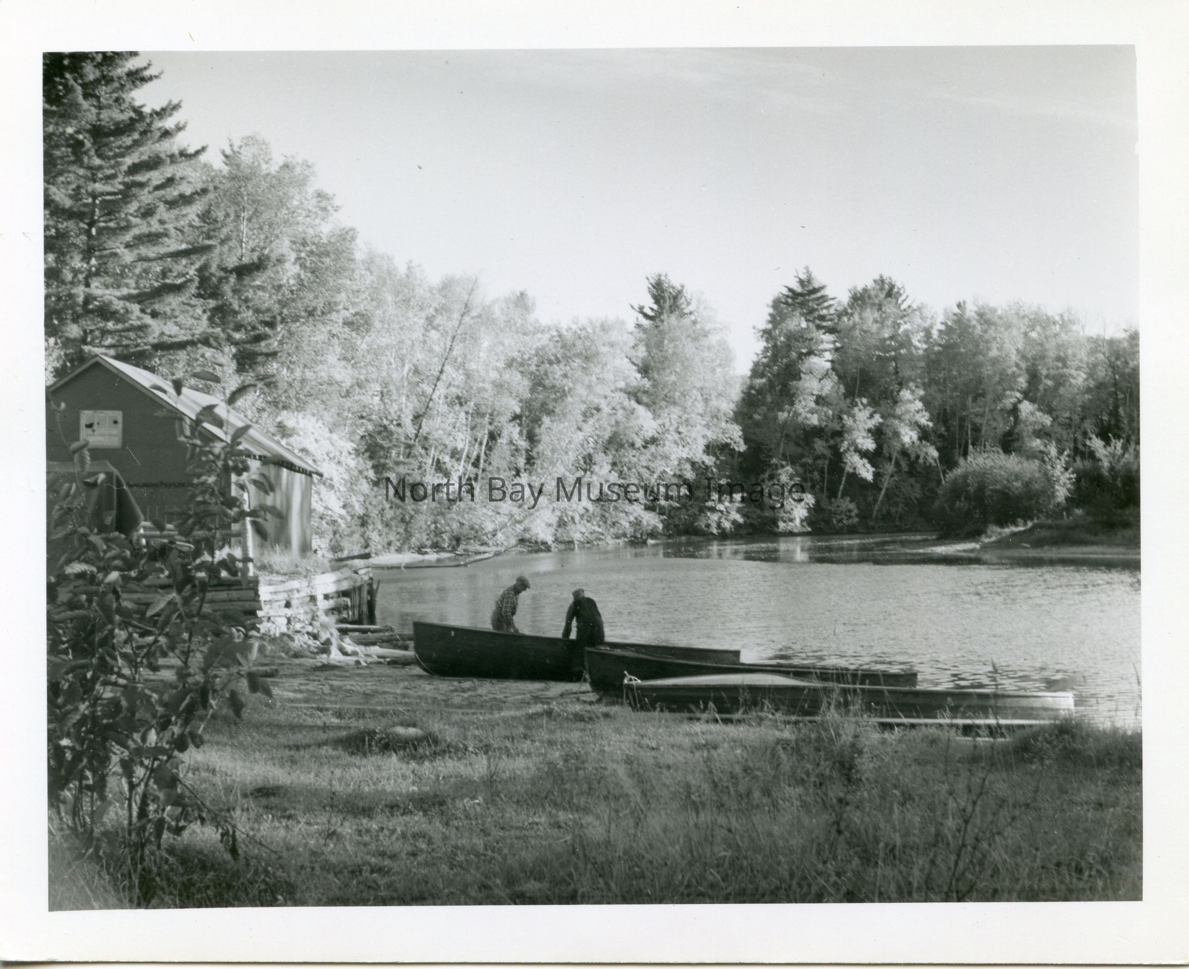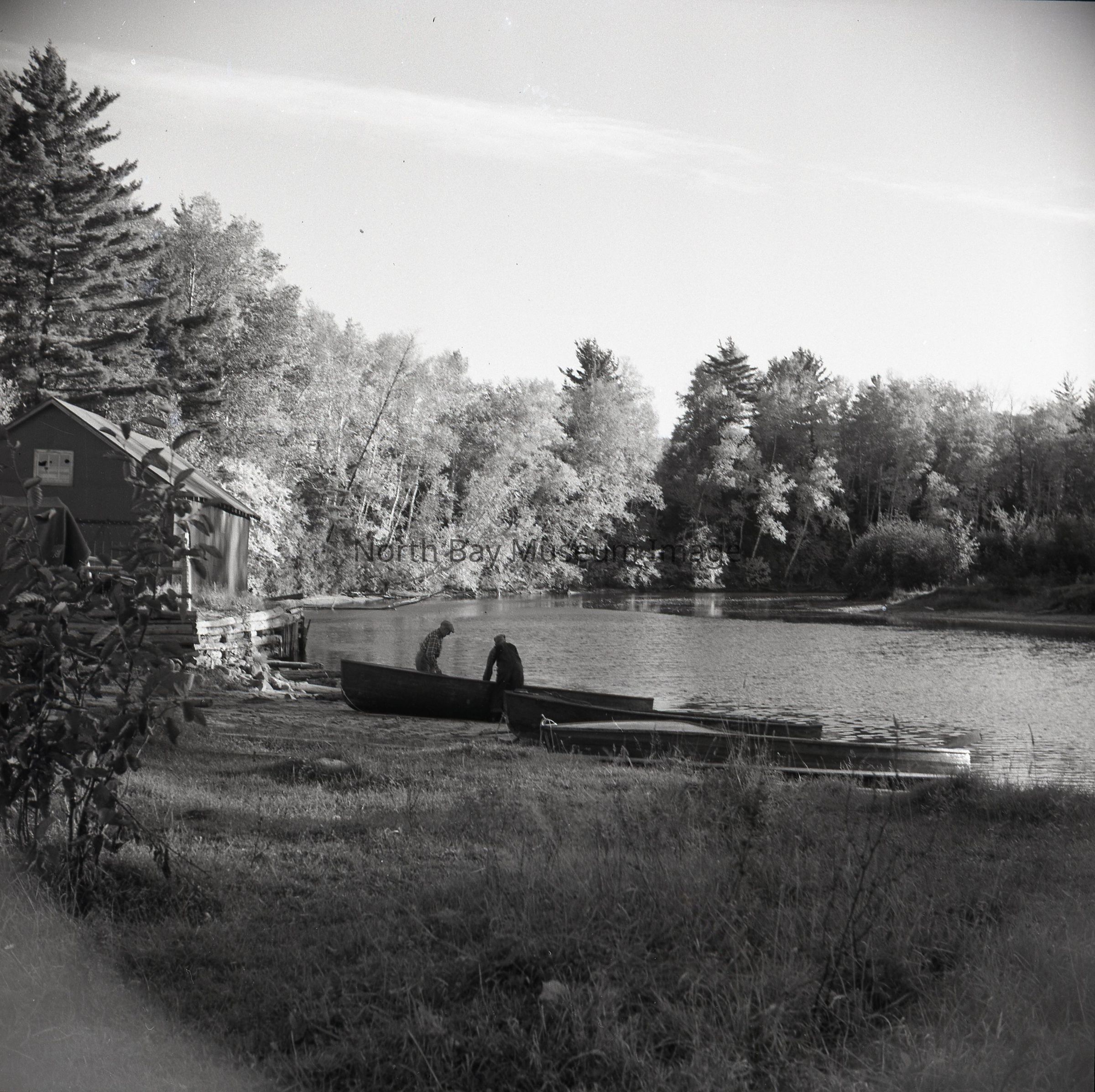 Photographer's envelope (a) contains a photograph and negative (d-h) of South River and boats. These images were taken in South River on Lake Nipissing. The images show two men pulling canoes and boats up from the lake onto the land and also show the boathouse where the boats are stored in the winter months when the lake is frozen. Publications are listed on the envelopes. A part of the Forder Collection.Creator