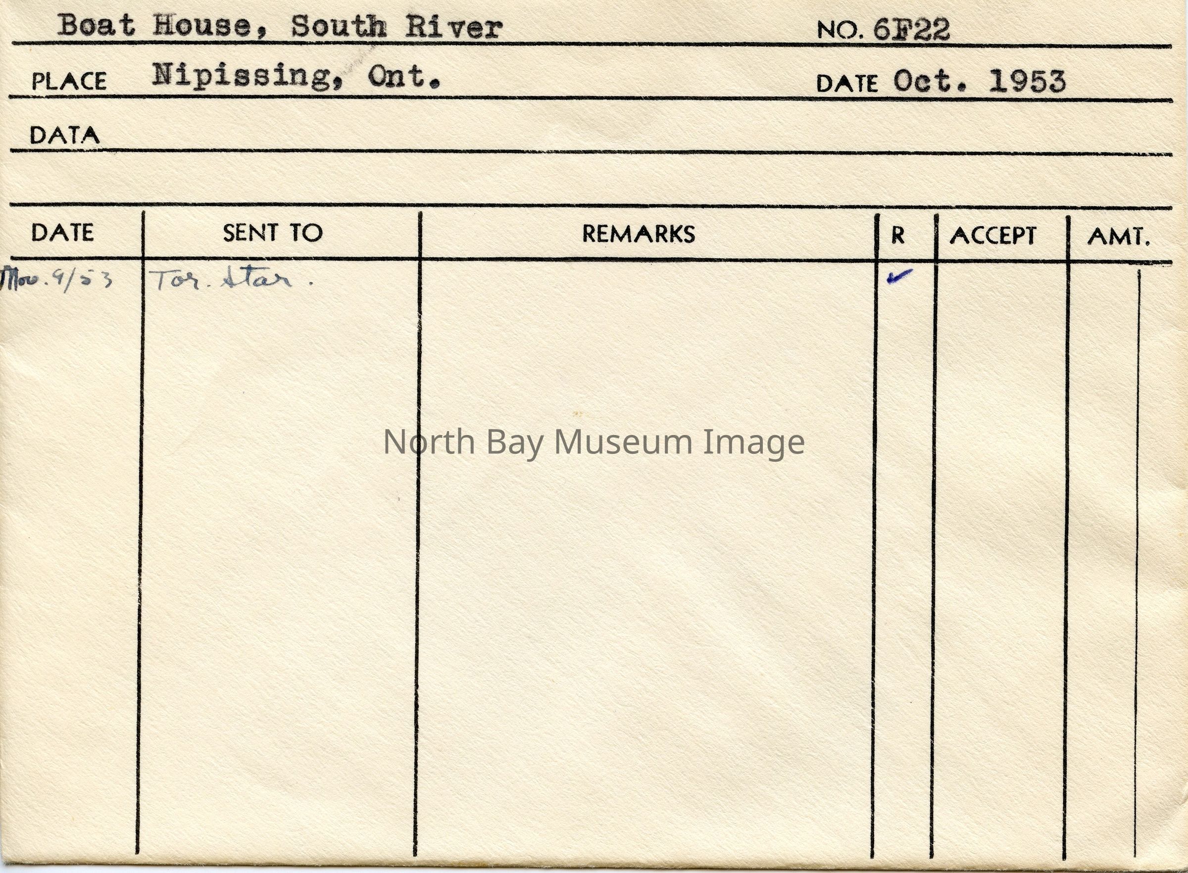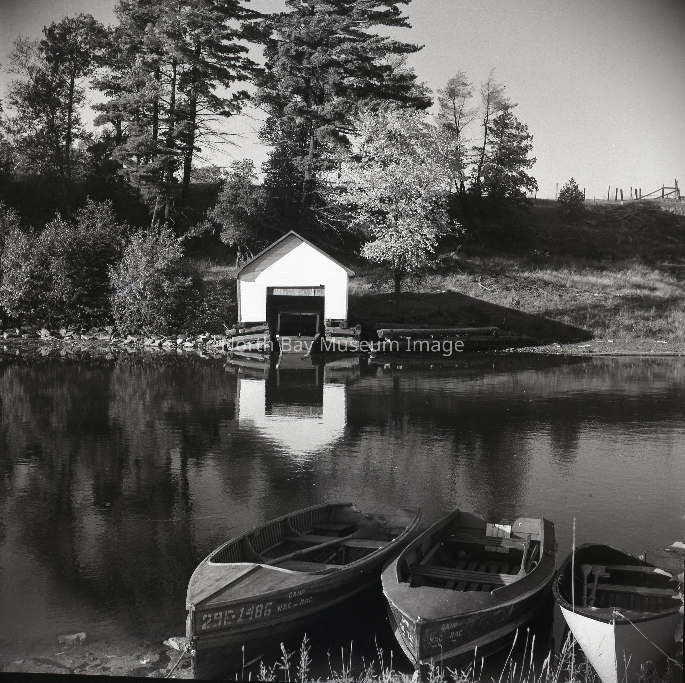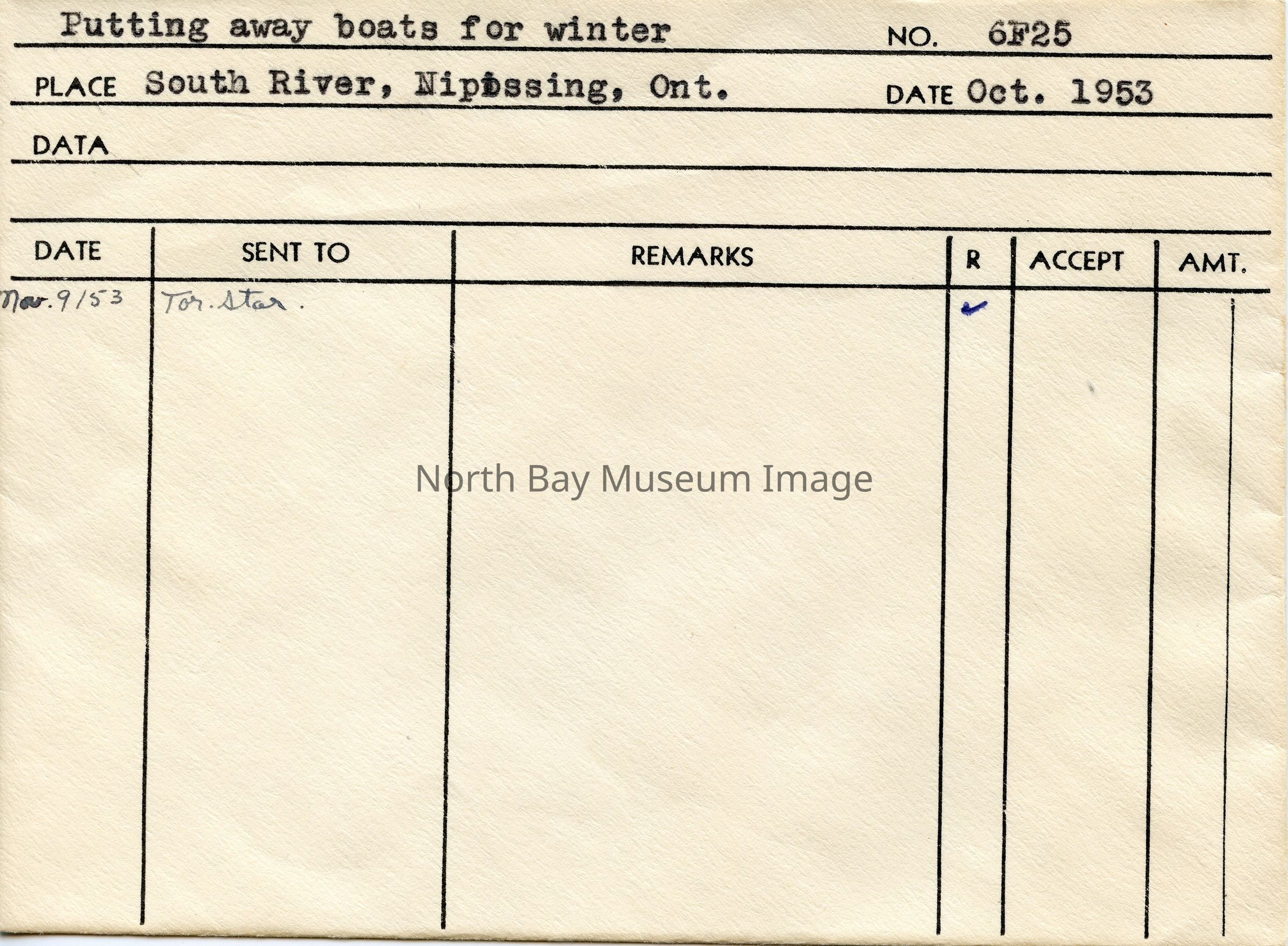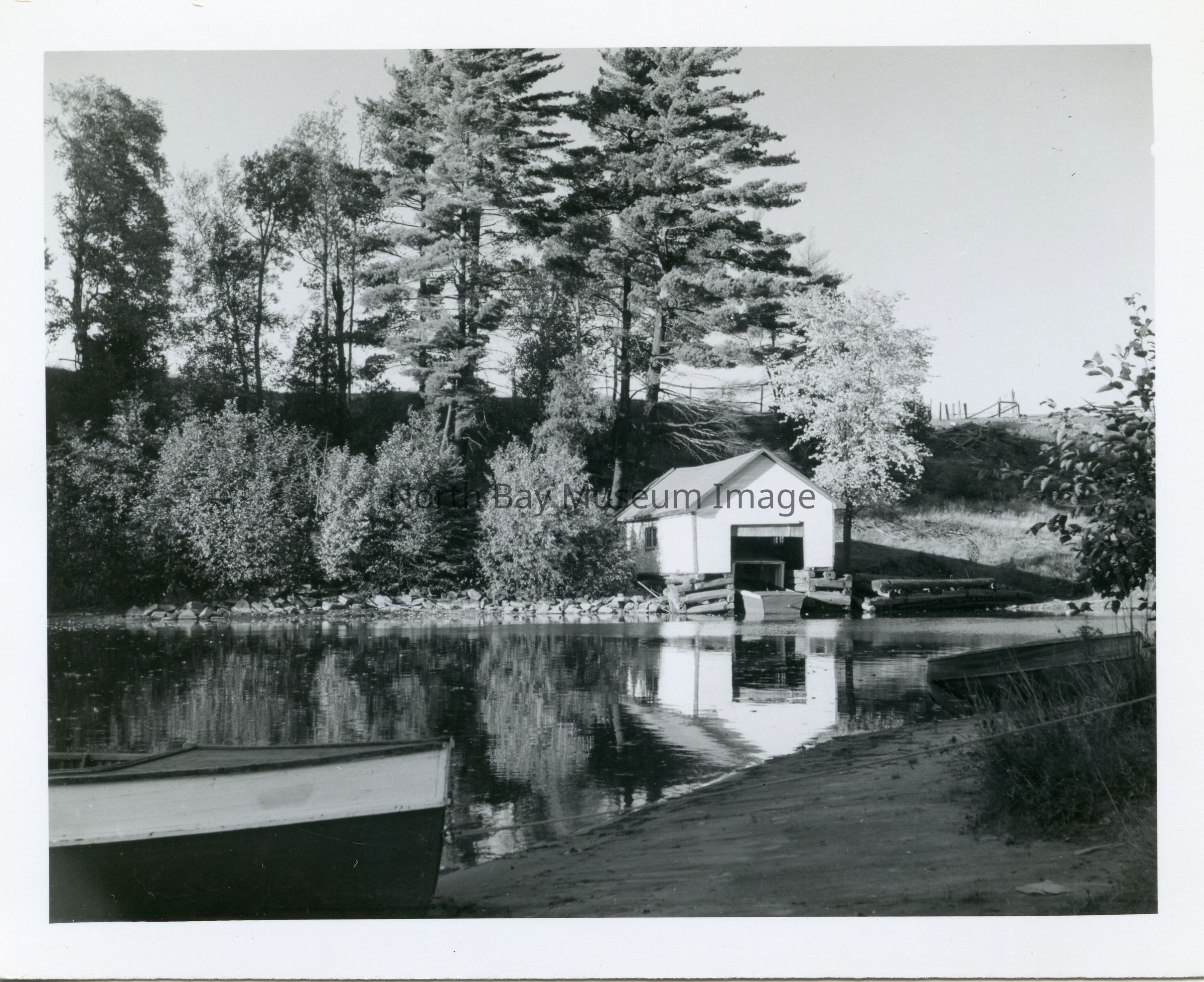 Photographer's envelope (a) contains a photograph and negative (d-h) of South River and boats. These images were taken in South River on Lake Nipissing. The images show two men pulling canoes and boats up from the lake onto the land and also show the boathouse where the boats are stored in the winter months when the lake is frozen. Publications are listed on the envelopes. A part of the Forder Collection.Creator
