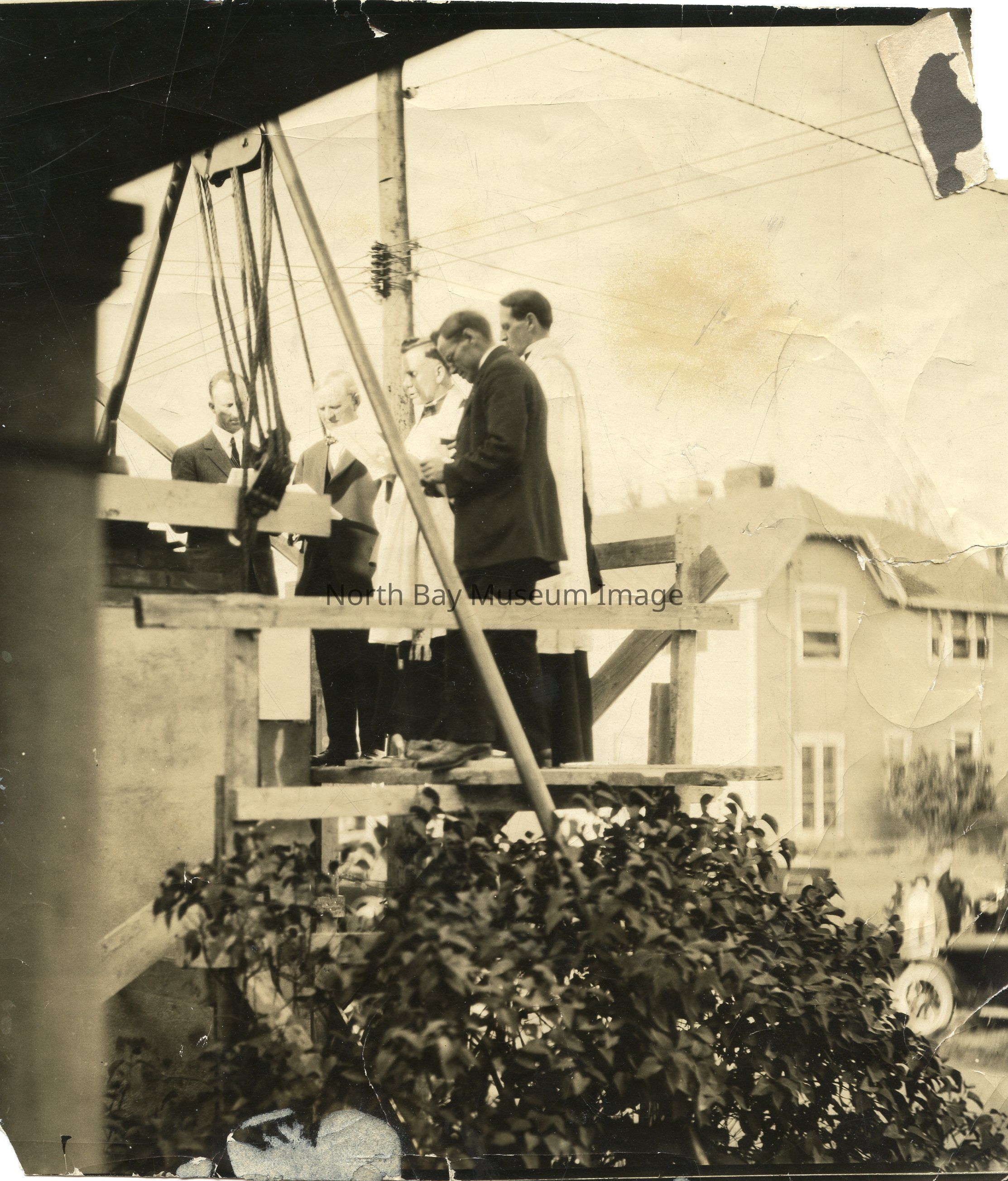 Black & white picture of 5 men on a deck, laying the cornerstone of St. John's Parish Hall. Mr. George Sterens, Reverend Balfour and Reverend Oliver are identified on back of the picture. There is a bush in the foreground of the picture and a car and people to the far right.Date(s) of Creation