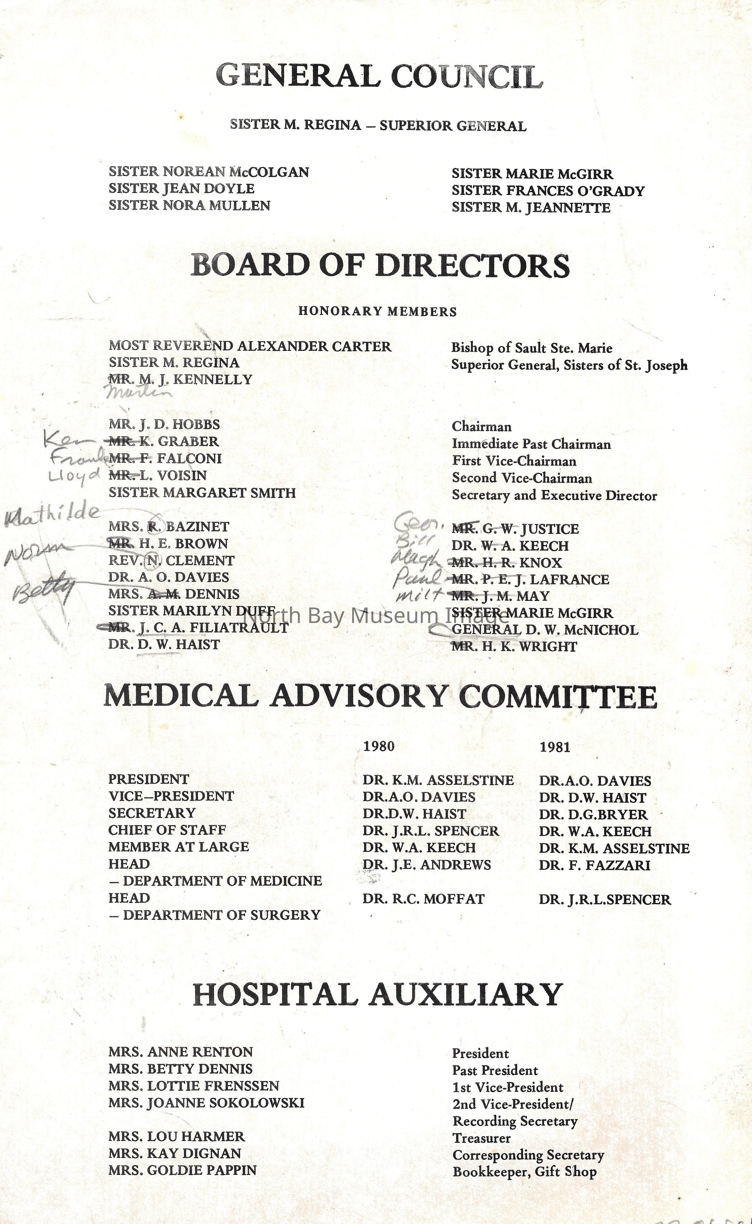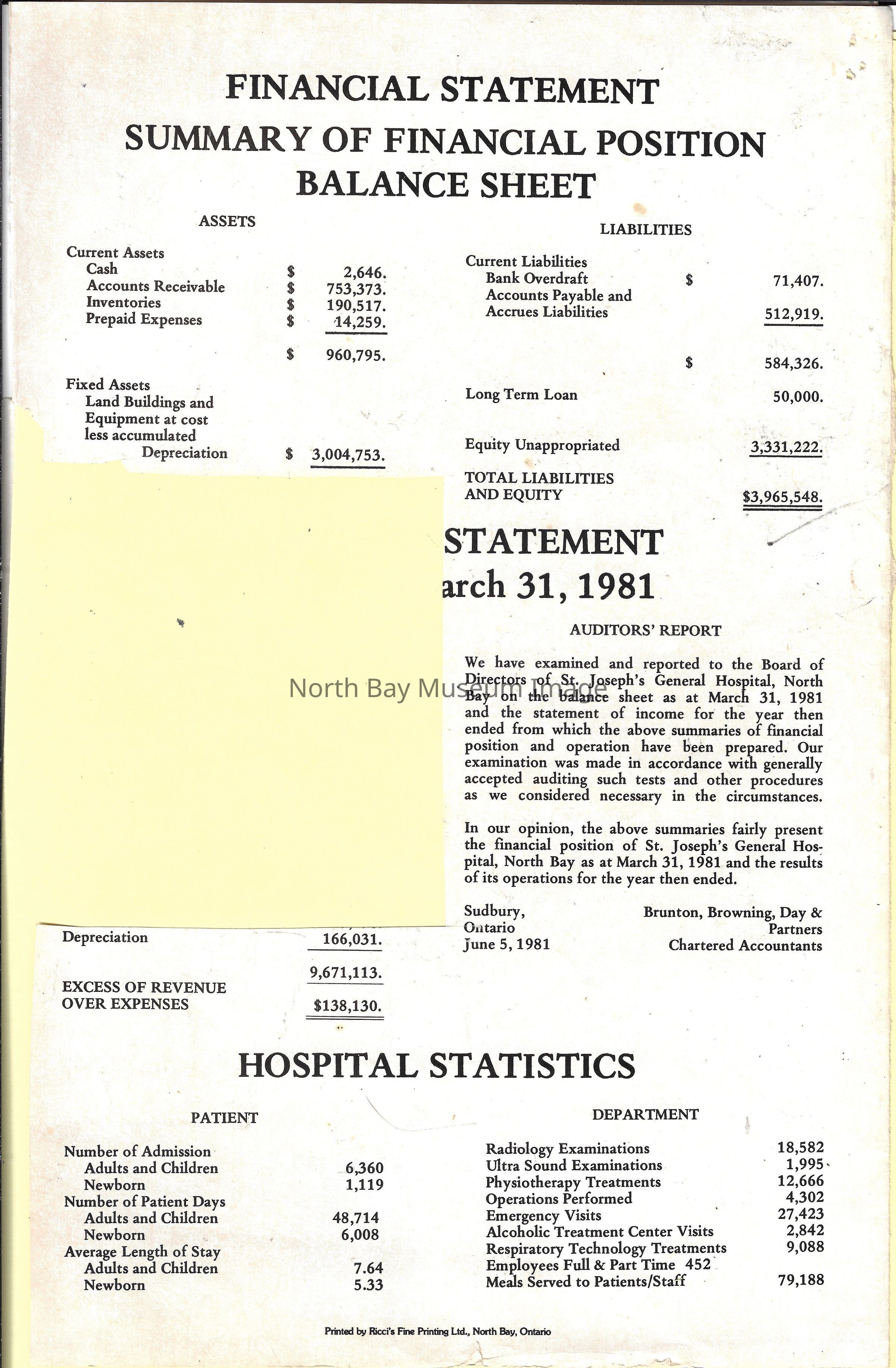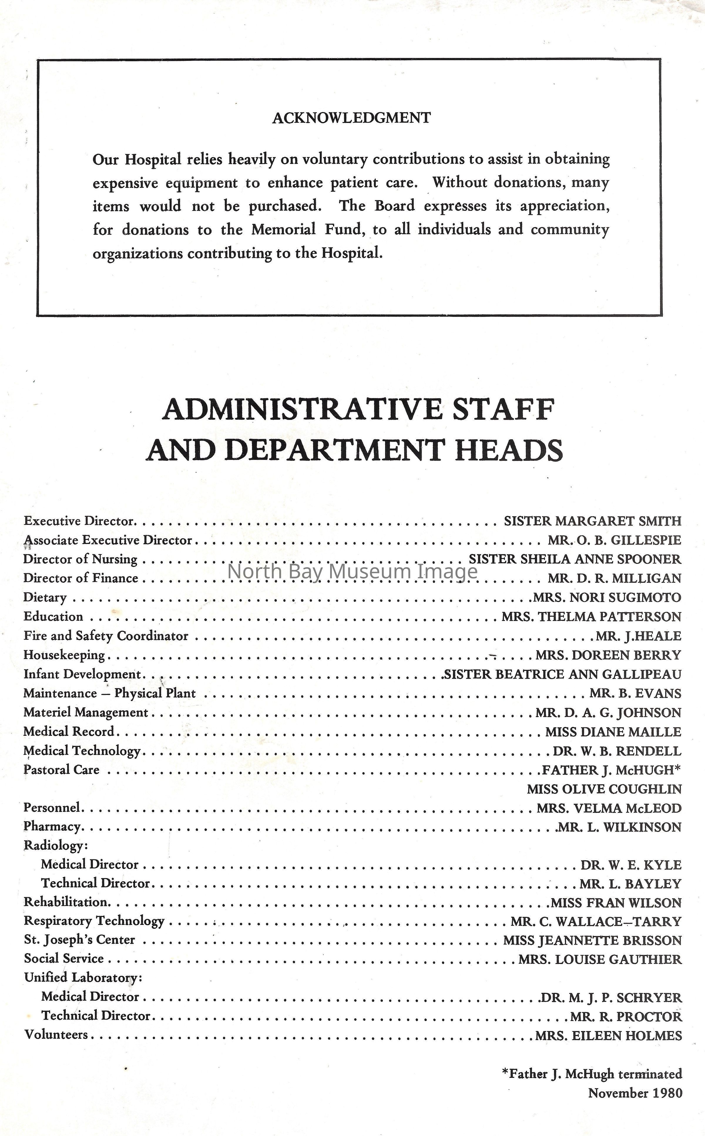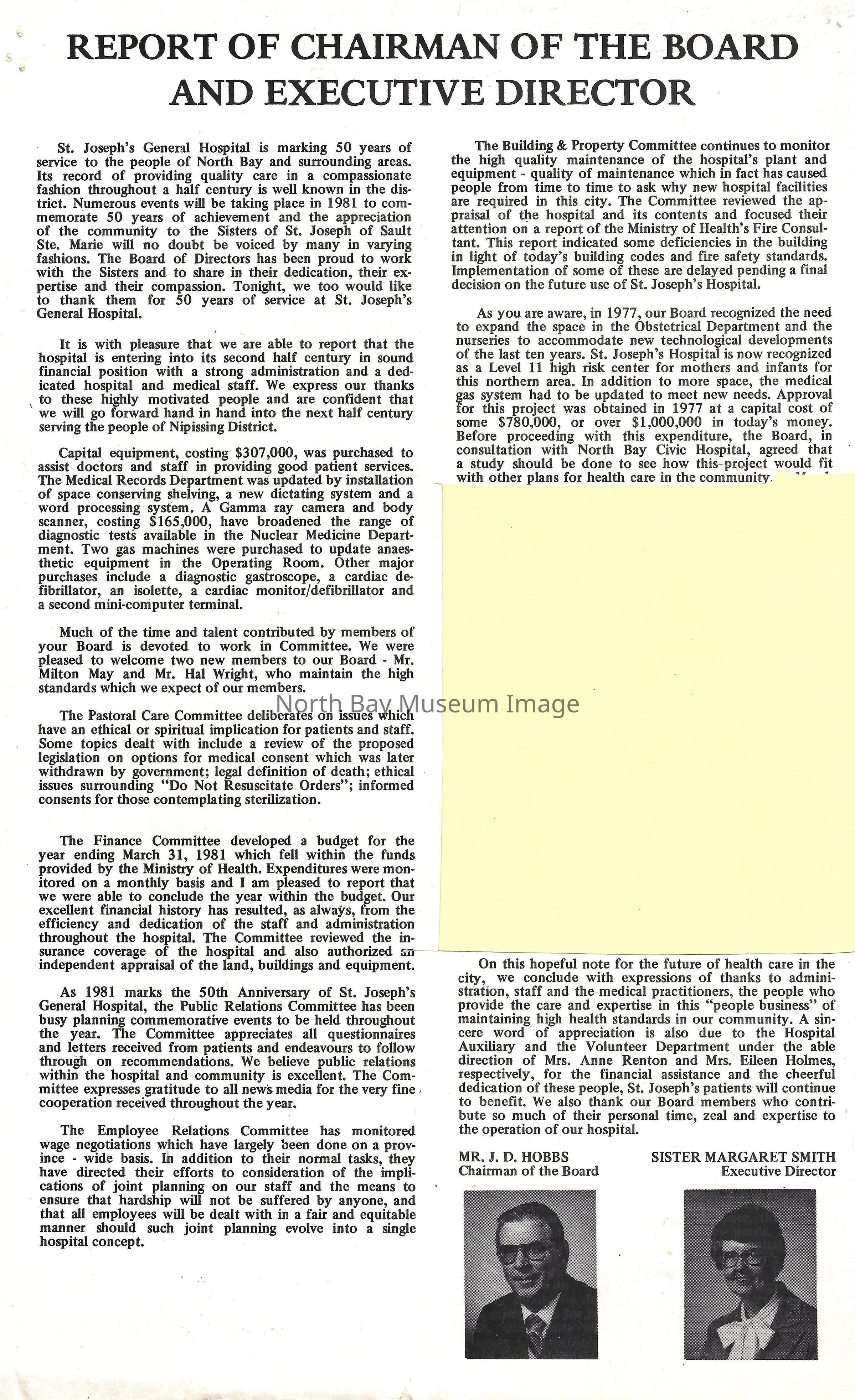 Photos of St. Joseph's Hospital staff, chapel, giftshop, and exterior building. Financial statement and list of staff.