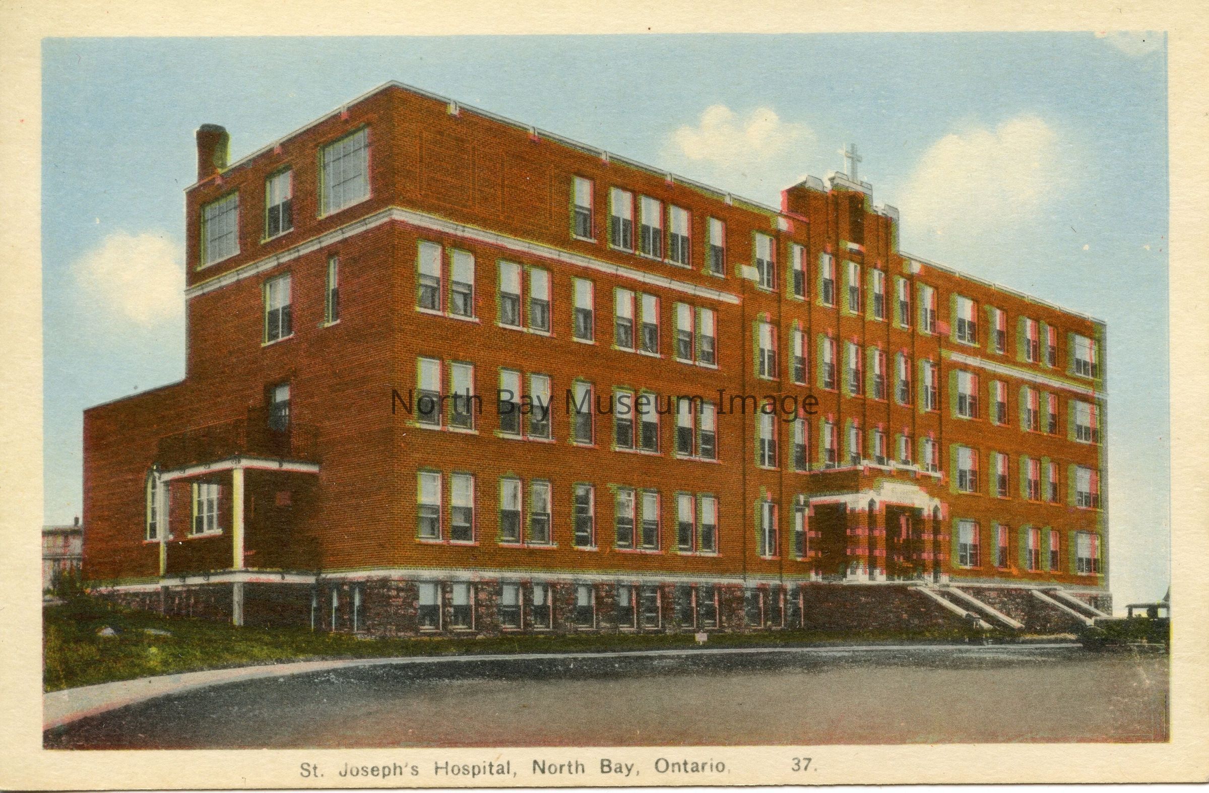 Color photo of St. Joseph's Hospital, North Bay, located on McLaren St. Four-story brick building with large stone stairway at front entrance.