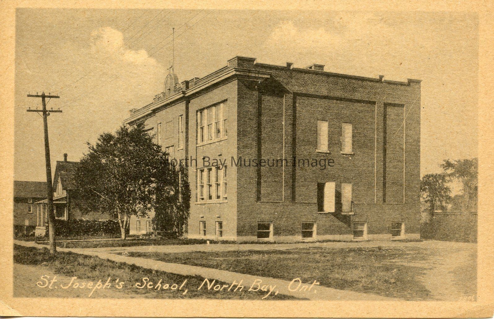 -Postcard of North Bay's St. Joseph's School. The black and white image shows the side profile of the school. The postcard is 5.5 x 3.5. The school is a 2 story brick building. The grass at the right hand side appears to be dead. The trees and small plants and shrubs are well manicured.