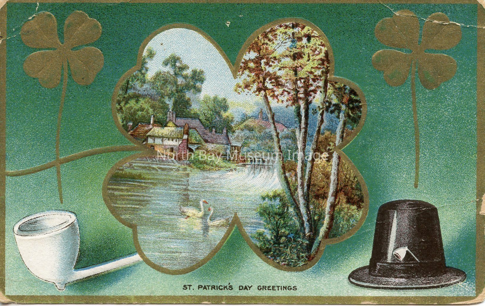 A "St. Patrick's Day Greeting" Postcard. The front of the postcard has a green background. In the center of the postcard is an outline of a four leaf clover with an illustration of the Irish country side. On both the left and right side at the top are gold four leaf clovers. On the bottom left side there is a image of a white pipe. On the bottom right side of the postcard is an image of a Leprechaun black top hat.