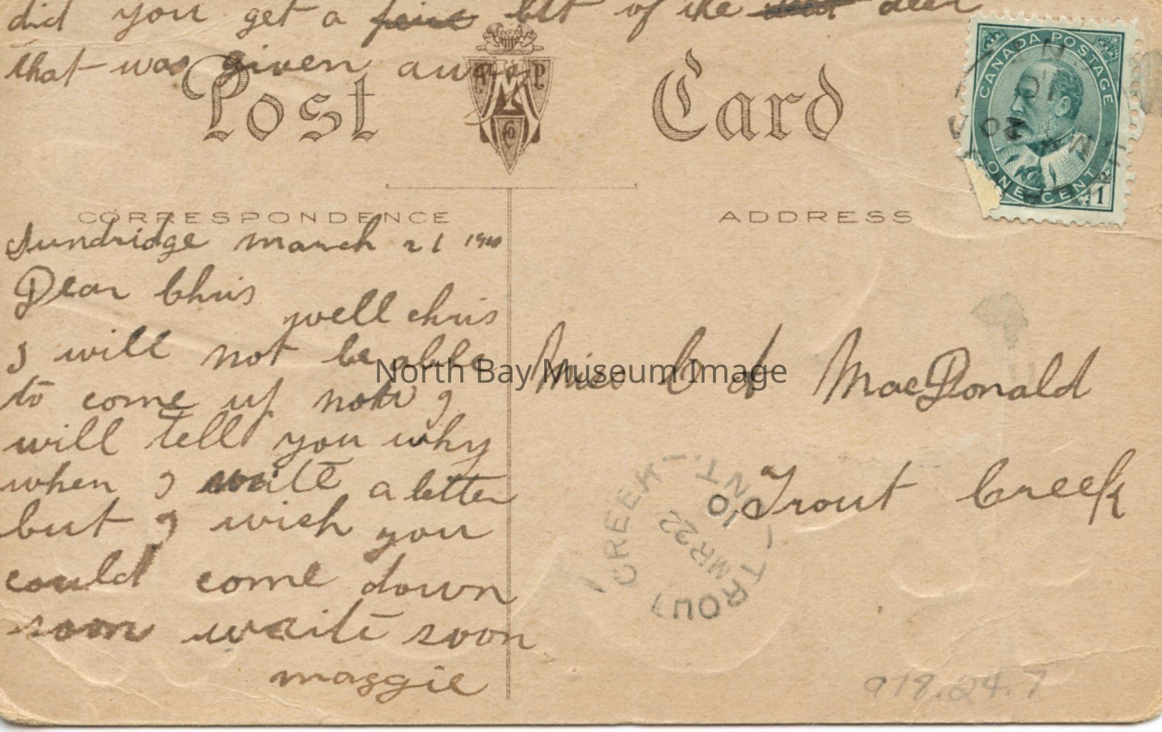 The postcard is from 1910. On the back of the postcard there is a handwritten message in black ink. There is also the stamp of the back right at the top.