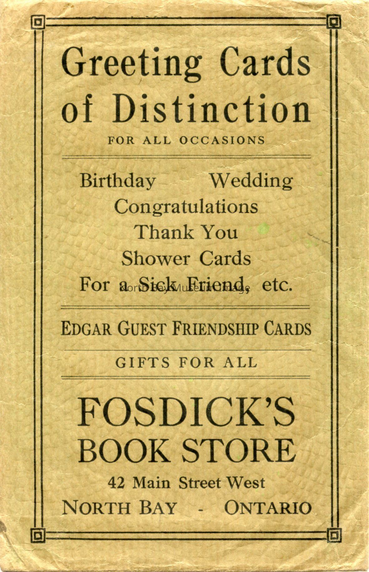 A Green envelope (982.62.2a) states, "Greeting Cards of Distinction, For All Occasions - Birthday, Wedding, Congratulations, Thank You, Shower Cards, For a Sick Friend, etc. Edgar Guest Friendship Cards, Gifts for all, Fosdick's Book Store, 42 Main St. W., North Bay, Ontario," written in black writing.
