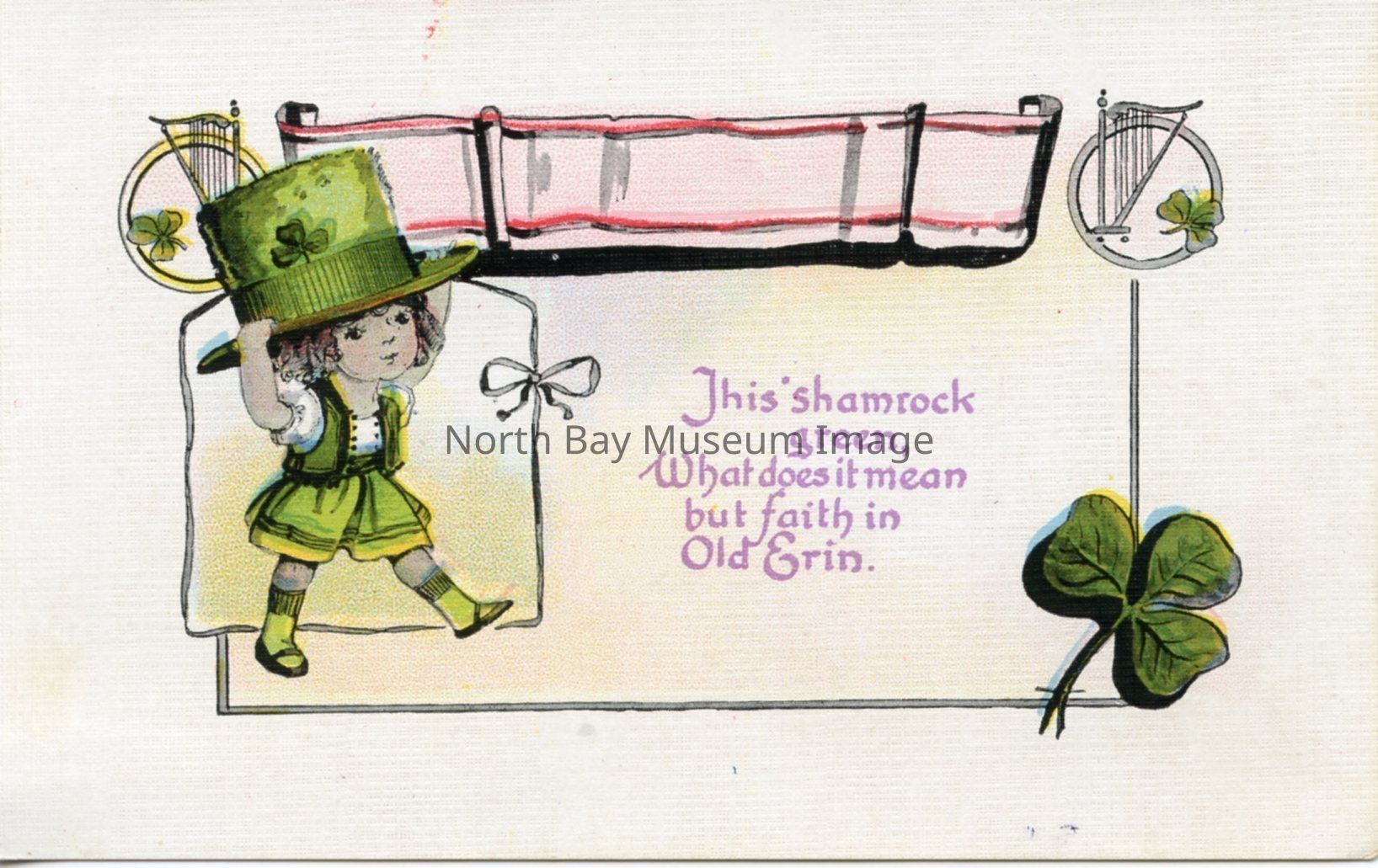 982.62.2c is a white post card with pink writing. The writing says "This shamrock green, what does it mean, but faith in Old Erin." There is a picture of harps in top corners, shamrock in bottom right, picture of girls dressed in green with big leprechaun-type hat. On the back reads: Post card, Correspondence, Address, Place Stamp Here, Made in USA, Series No. 434, St. Patrick 6 Design.