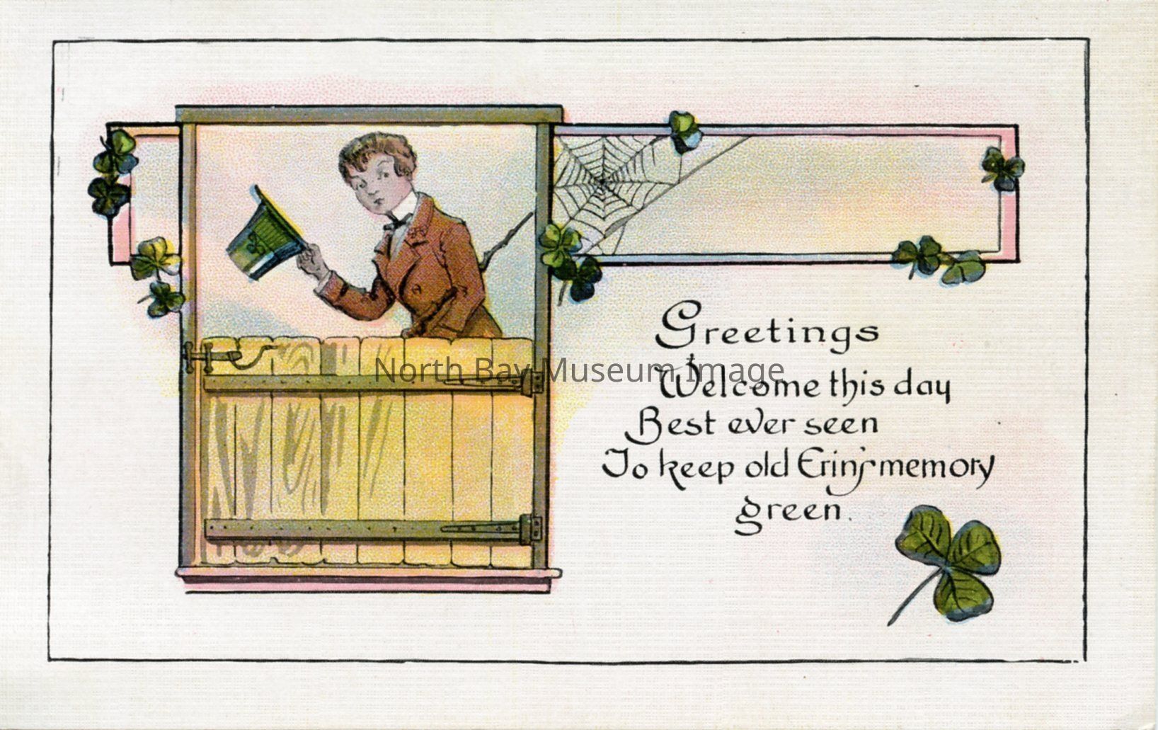 982.62.2d is a white post card with black writing. The text writes "Greetins Welcome this day, Best ever seen, To keep old Erin's memory, green"