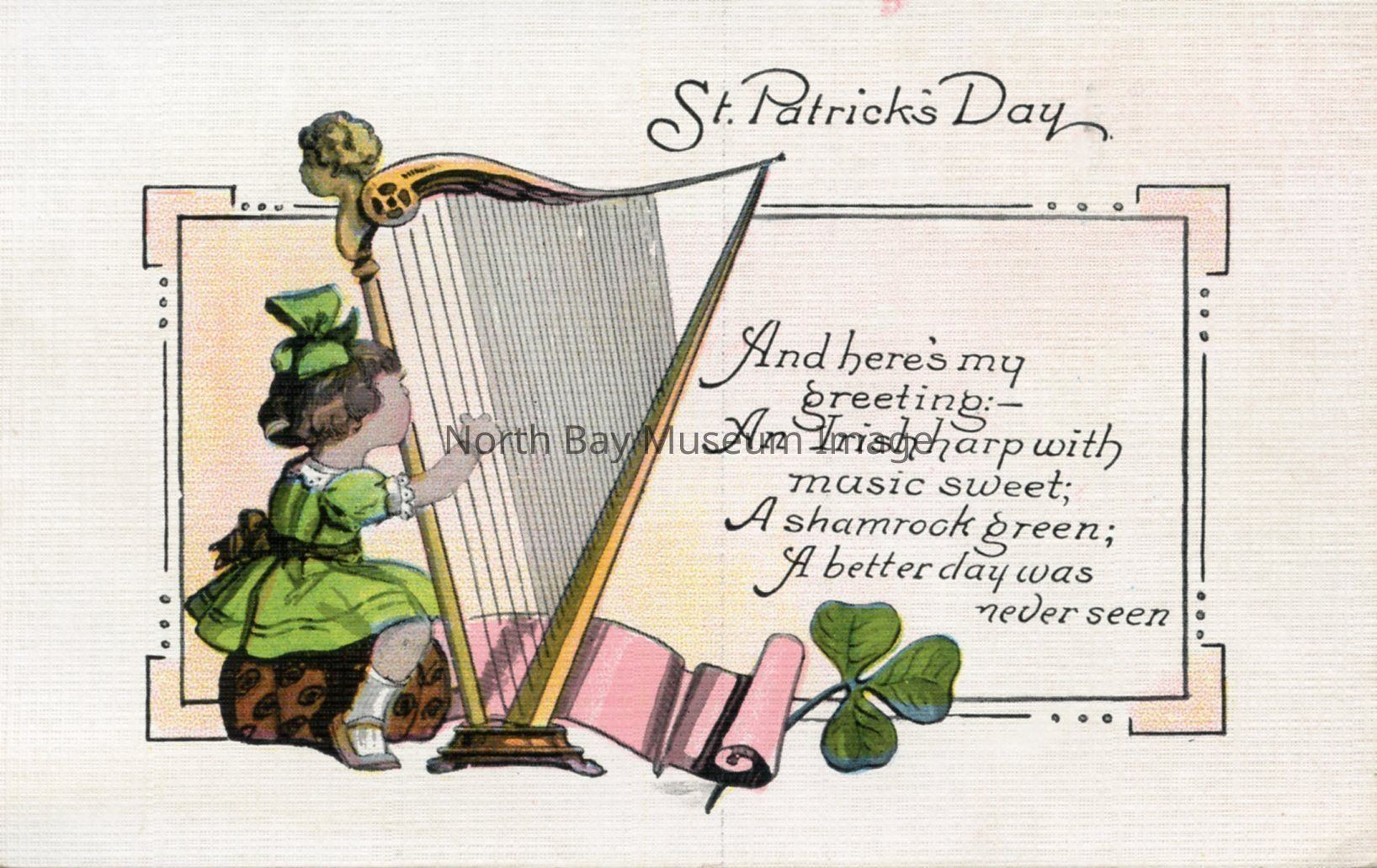 982.62.2b is a St. Patrick's Day Card. It is a flat post card, white with black writing and picture of a little girl in a green dress playing the harp. The back text reads: Post card, Correspondence, Address, Place Stamp Here, Made in USA, Series No. 434, St. Patrick 6 Design.