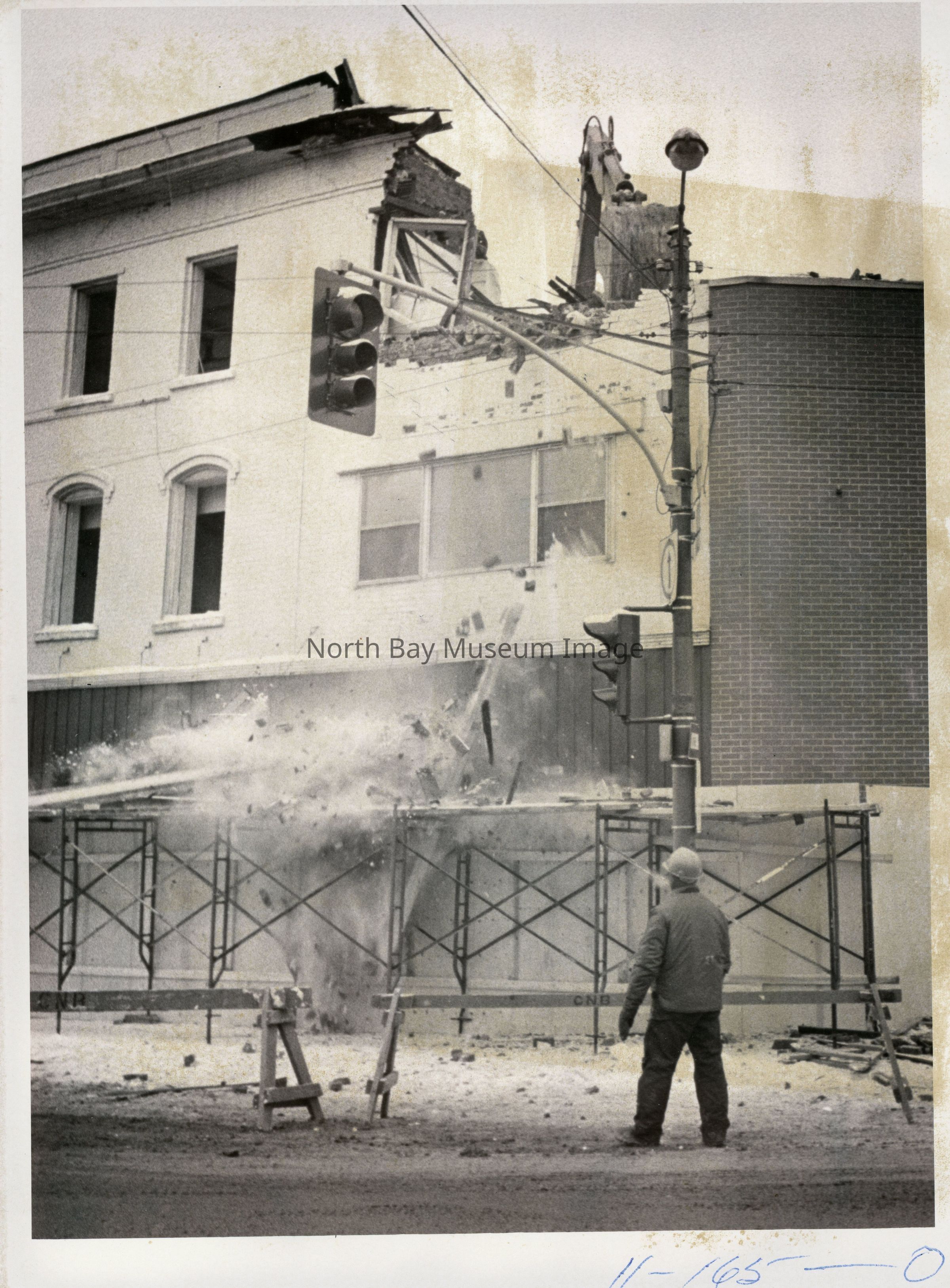 022.01.154e Demolition of the St. Regis hotel begins and debris falls onto the street. Picture in article is of a construction worker watching the demolition take place