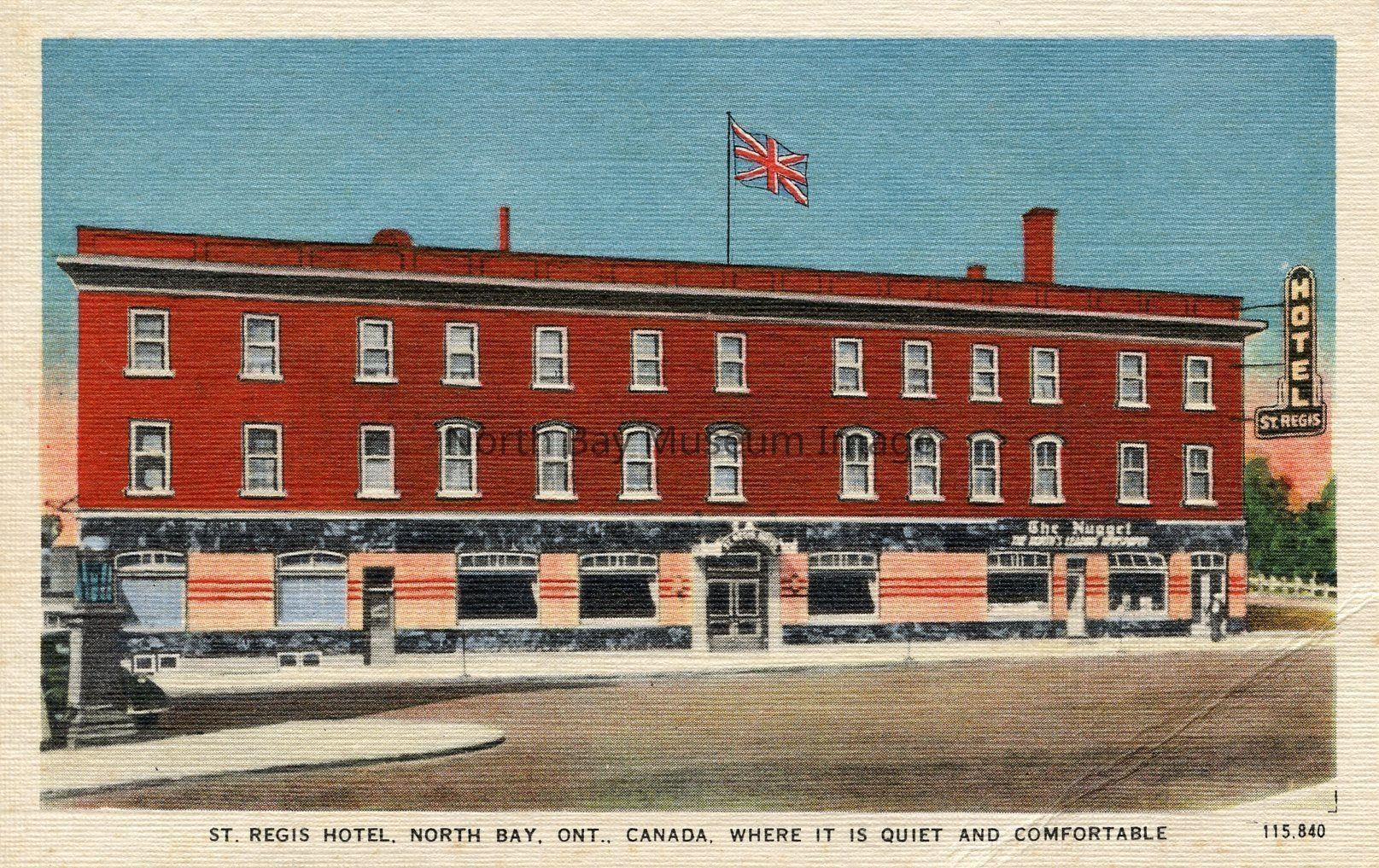 This is a colourized sktech drawing Postcard of the St. Regis Hotel in North Bay. The caption of the postcard reads "St. Regis Hotel, North Bay, Ont., Canada. Where it is Quiet and Comfortable" printed below the image on the front of the card. The building is a three storey red building. There is a Union Jack flag flying in the middle of the building. The number 115.840 printed in the lower right corner. This postcard is published by Valentine Black Co. Ltd., Toronto, Canada printed in blue up the left side of the back of the card. The words "V & Sons Postcard - Famous Throughout the World" are printed across and around a small grid map of the globe in the upper center portion of the back of the card