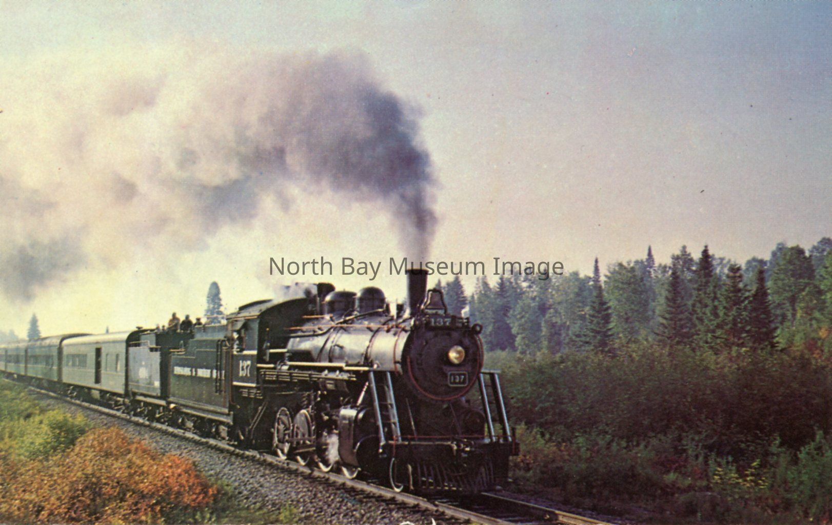 Printed on the postcard is 'the sound of steam is heard once more in the misty Autumn air of Northern Ontario as the Ontario Northland Railway's old steam train (#137) takes a special excursion run out of North Bay for Temagami and points north.'