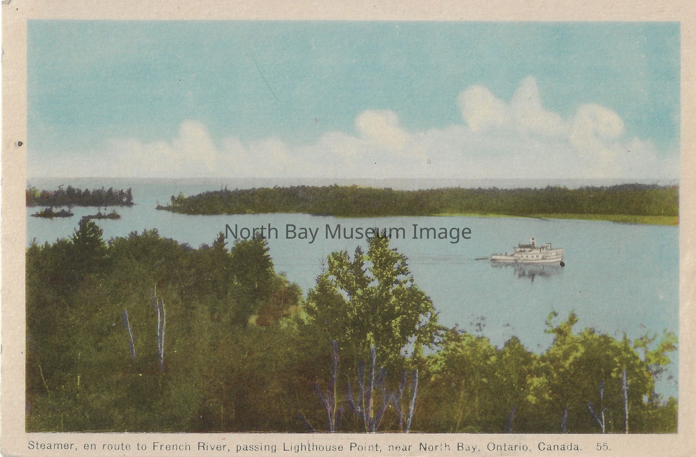 Colour, painted-postcard. The postcard depicts the French River. The water is a clear blue, and it is surrounded by the bush. There is a boat in the river. The caption reads "Steamer, en route to French River, passing Lighthouse Point, near North Bay, Ontario, Canada. 55."