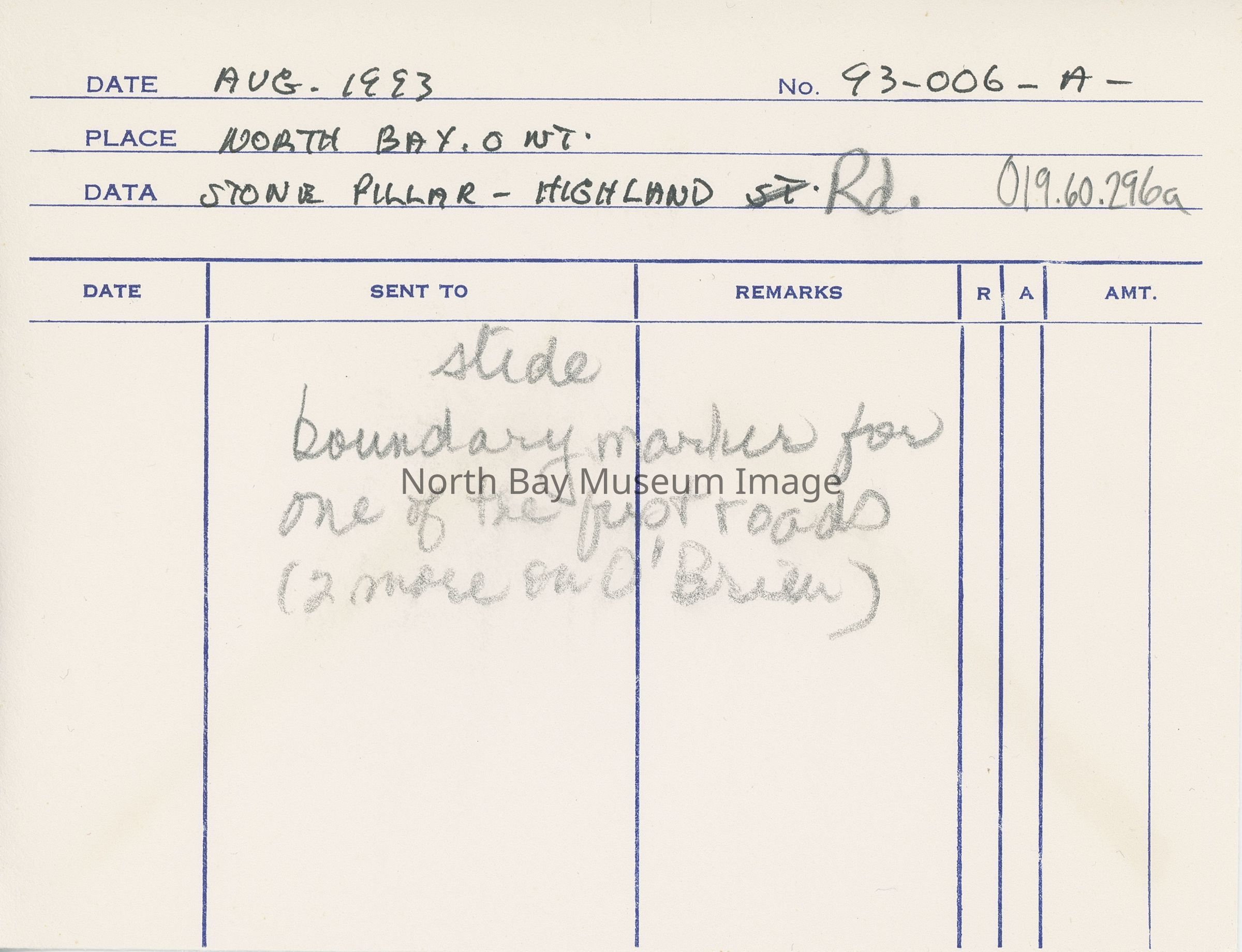 Photographer's original Envelope (a) contains slide (b) of a Stone Pillar on Highland Rd. in North Bay in August 1993.